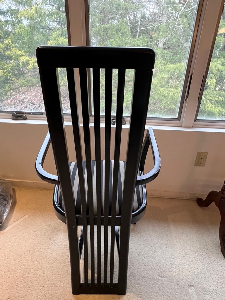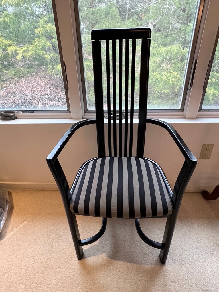 This is a postmodern black lacquered high-back armchair, possibly from the 1980s or 1990s, with a newly reupholstered black and white striped seat. The chair has a sleek, curved wooden frame and a tall vertical slat back. The design is often associated with Italian manufacturers such as Liberty Furniture Industries or Pietro Costantini.