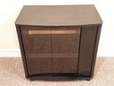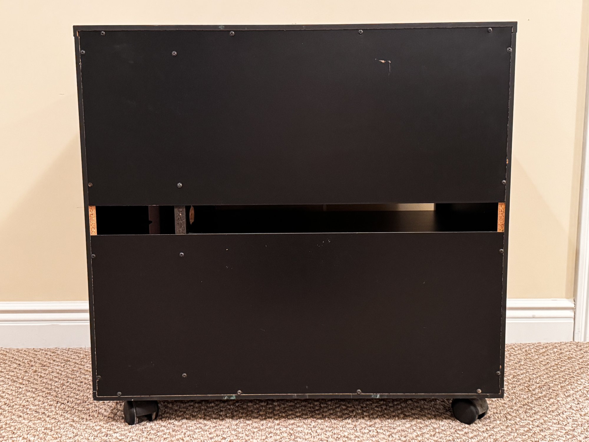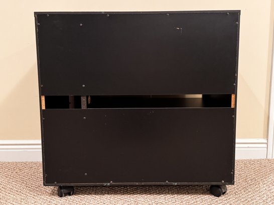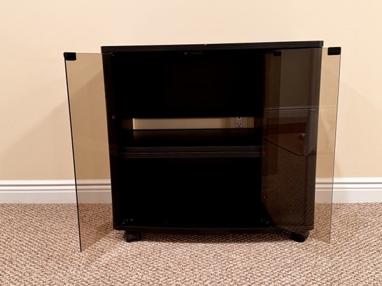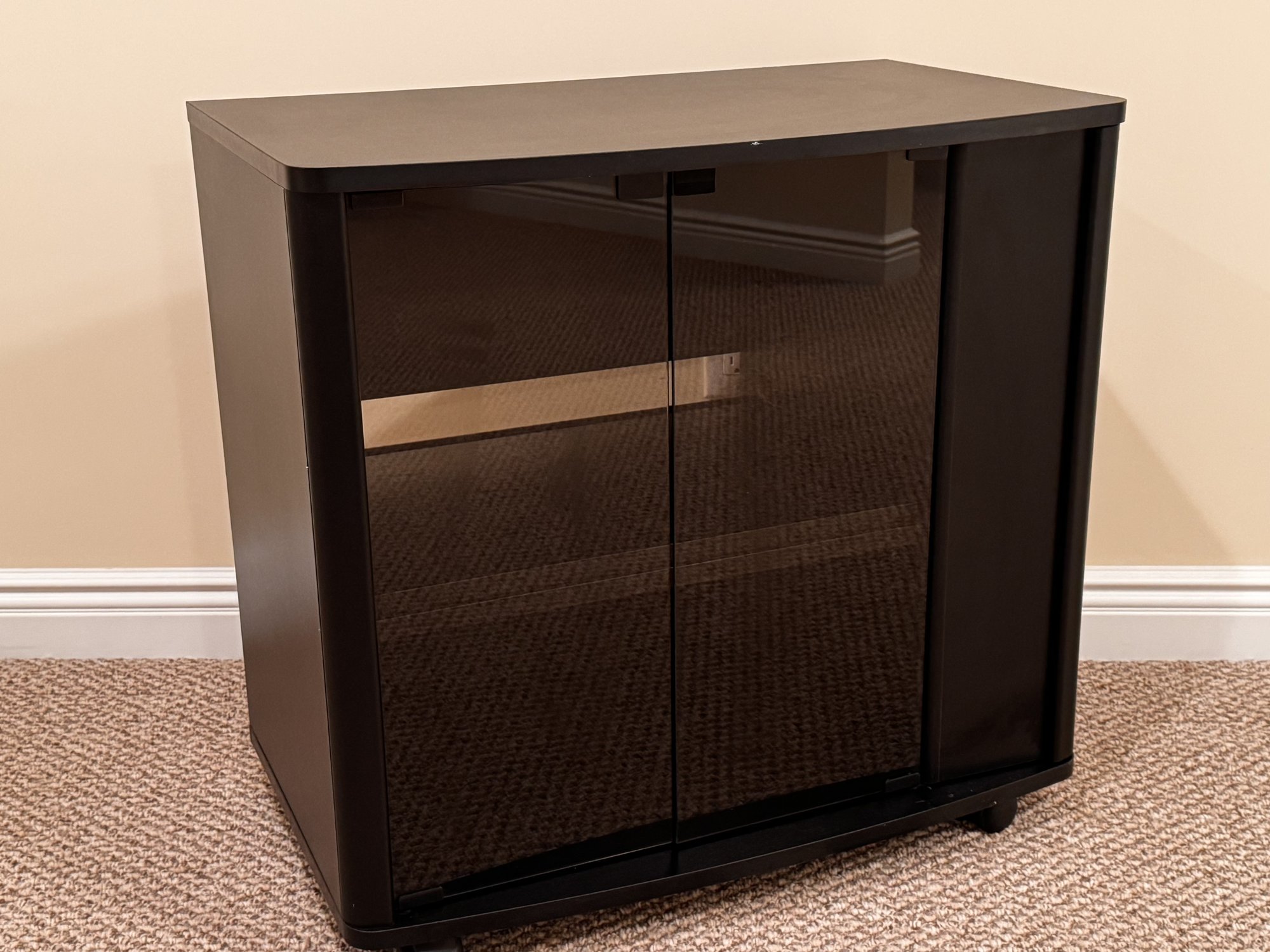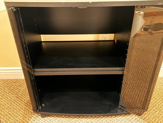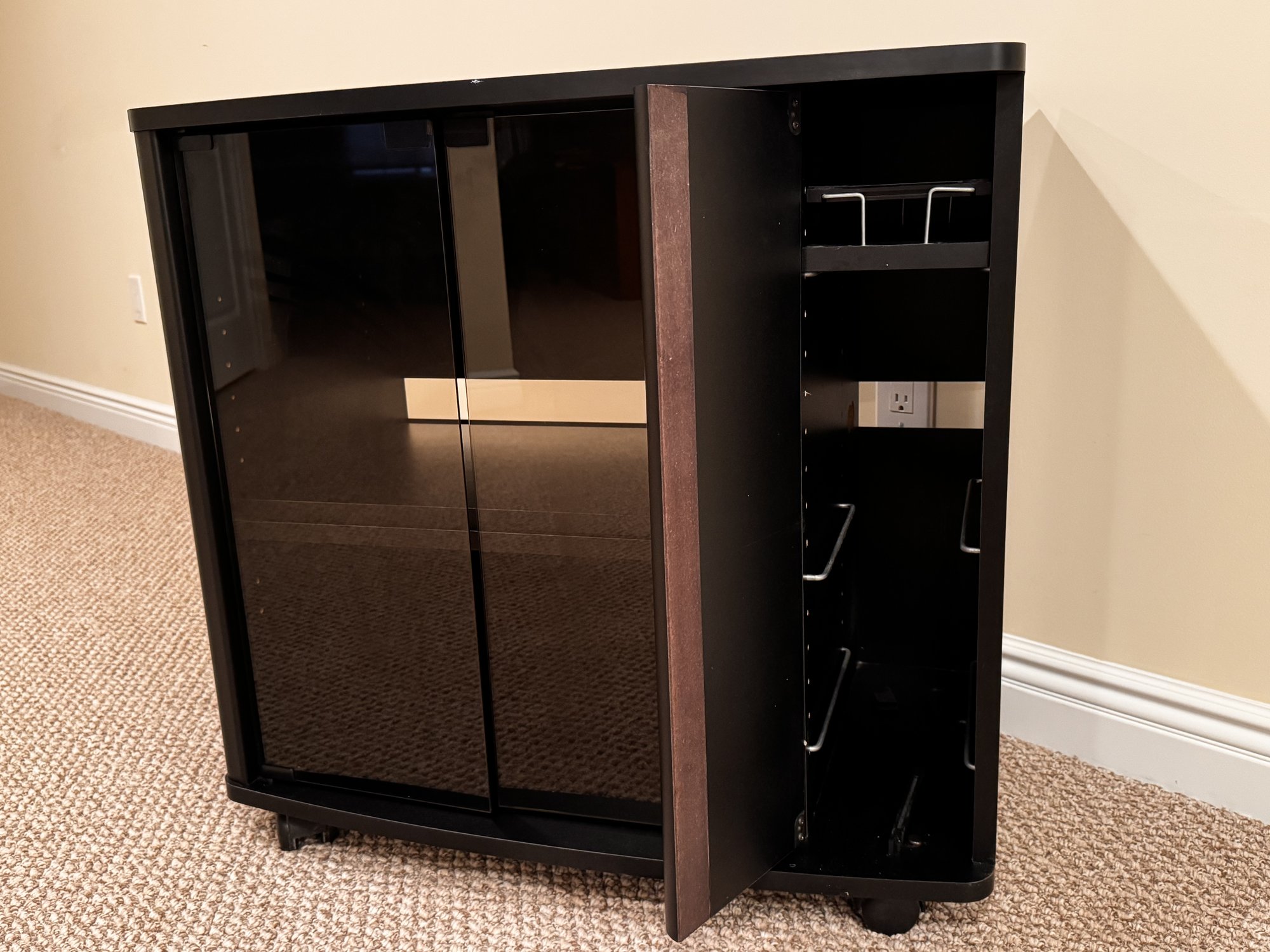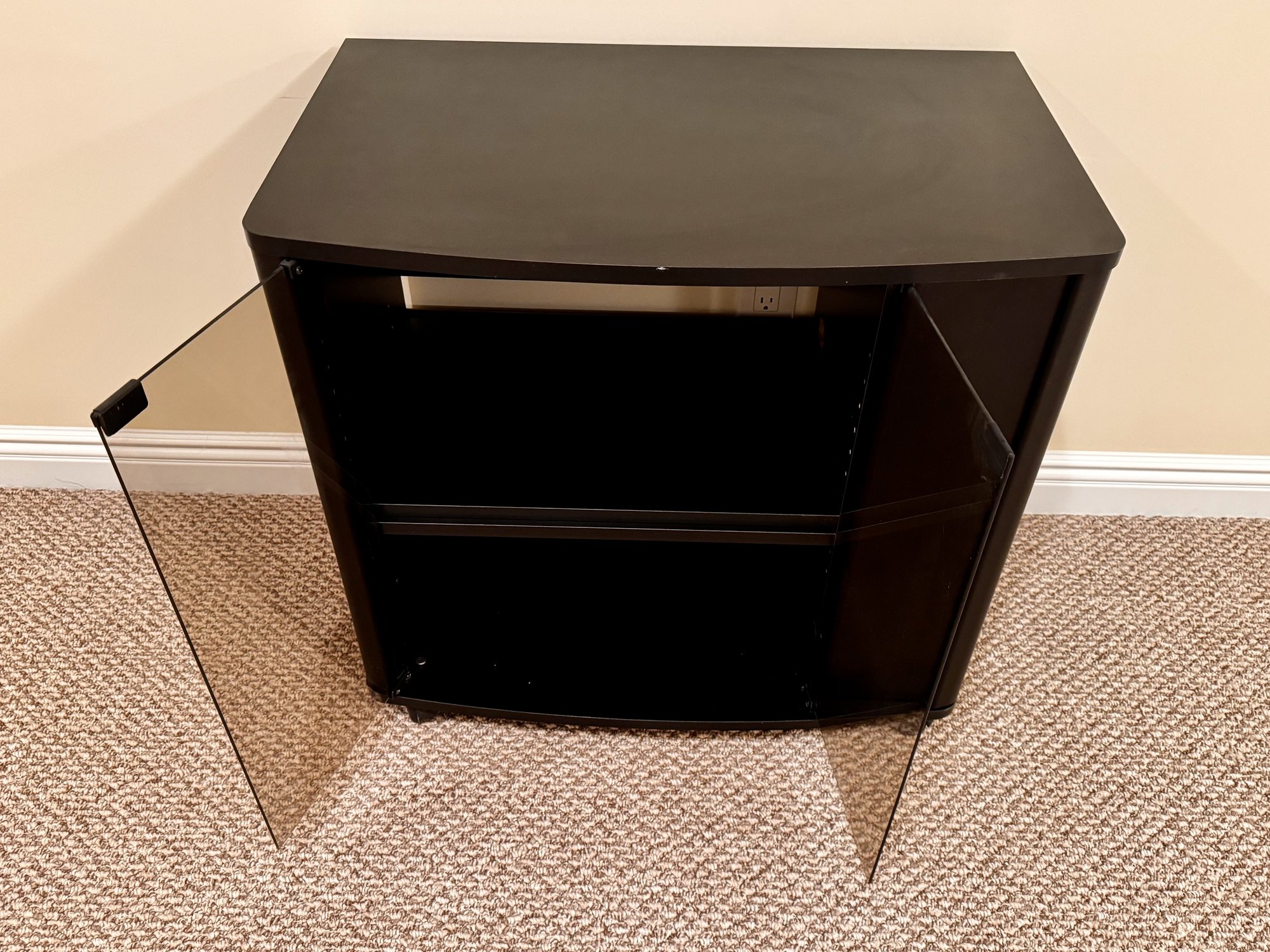 This black laminate media stand rests on casters for easy moving. Two glass front doors with magnetic closures house the main cabinet with 3 shelves; 1 stationary and 2 adjustable. One of the shelves is missing the pegs. There is a small side storage are for cd's or dvd's, but it only has one adjustable shelf.