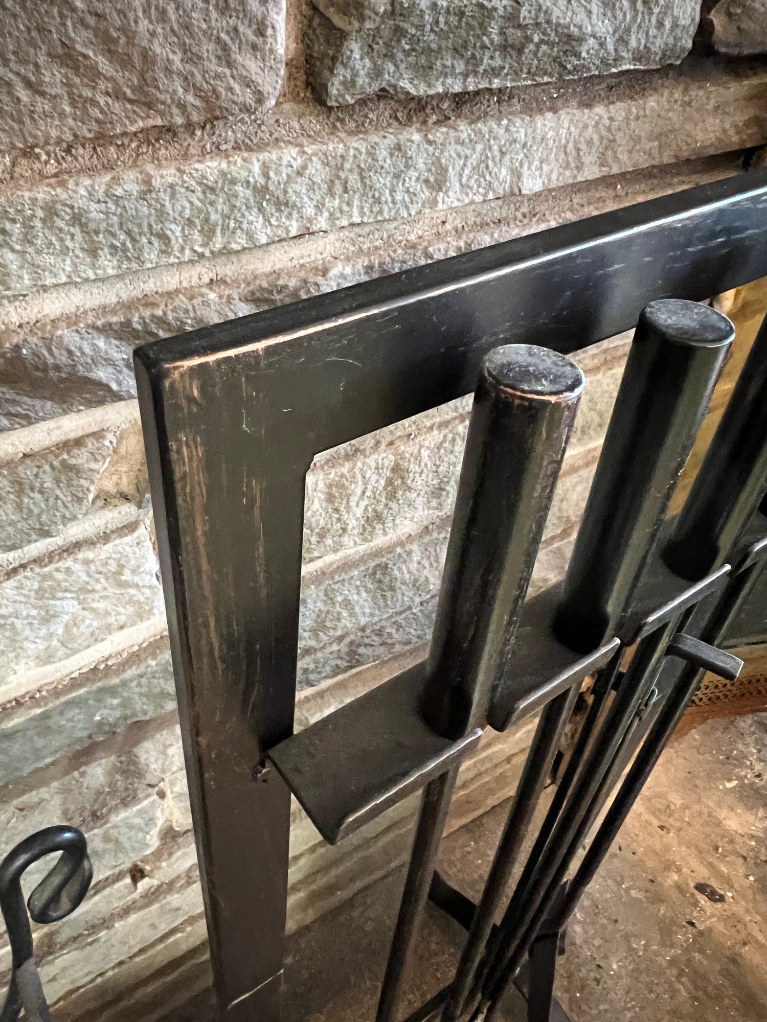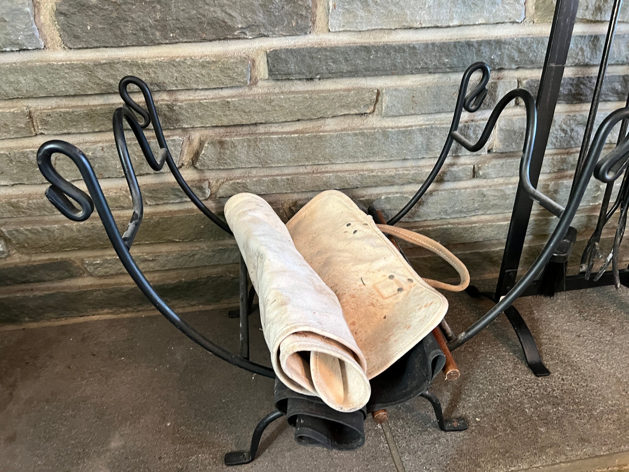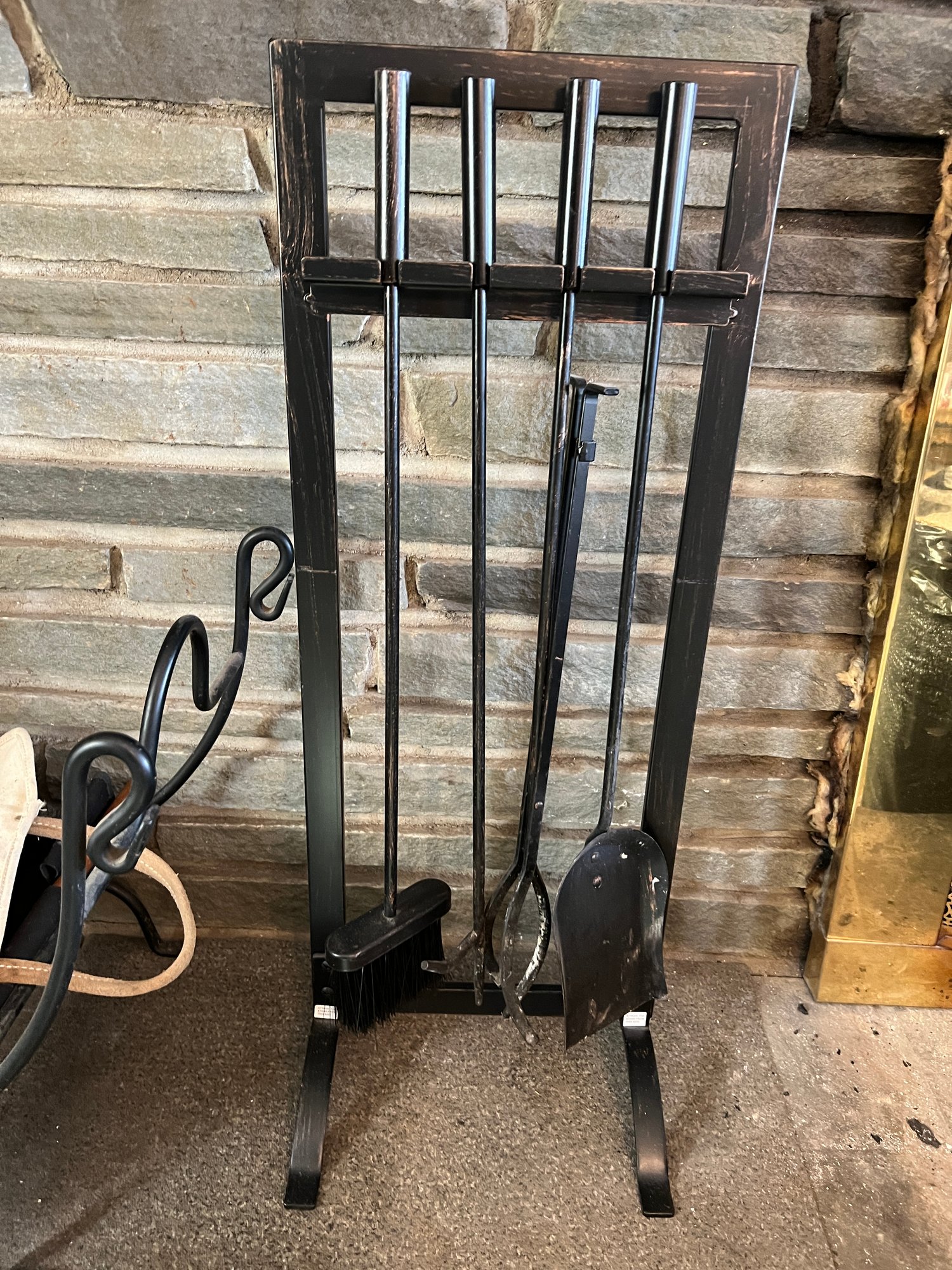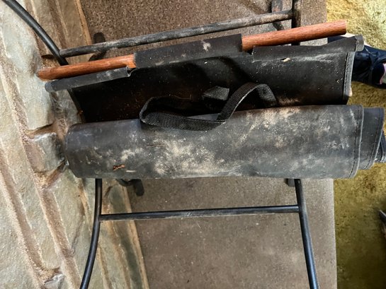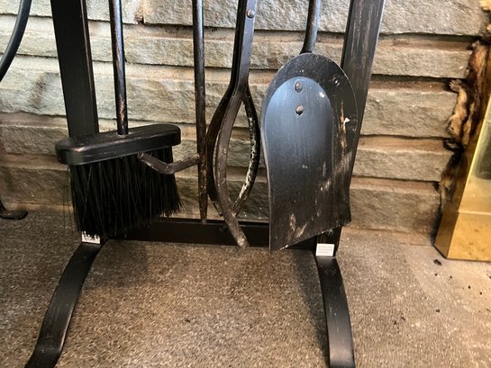 Set of fireplace tools in a stand in a black powder coated metal with a black scrolled metal log holder stand and two log carriers.