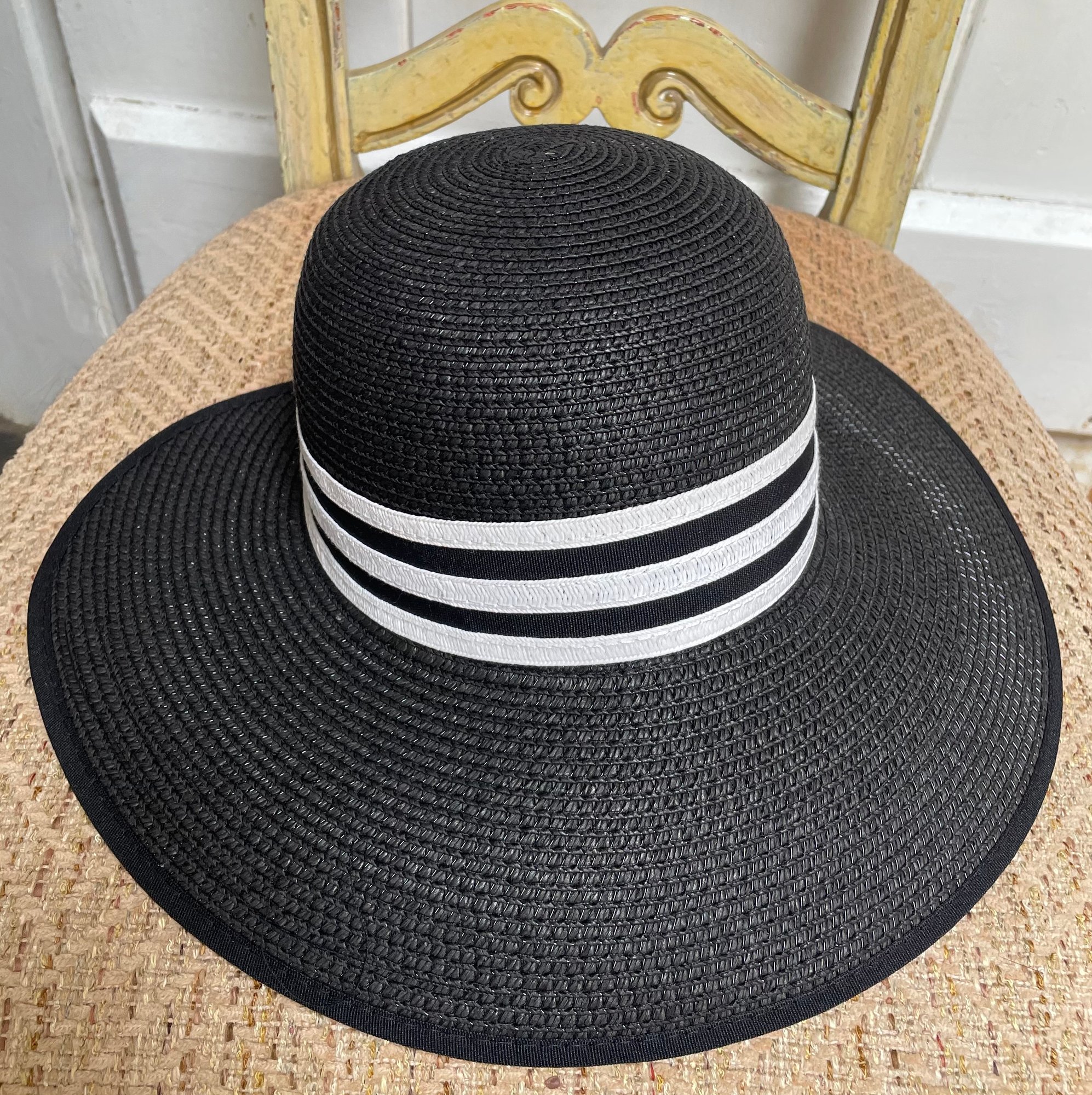 Good looking straw hat with a black and white band and wide brim. It's in very good condition and ready to shade you this summer.