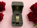 Gold tone watch with closed link chain and a diamond chip at 12:00 on the watch face. Works and the battery is fairly new.