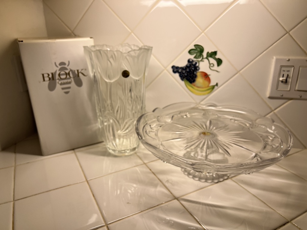 Block Vase, NIB With Cake Stand With Etched Seashell Design