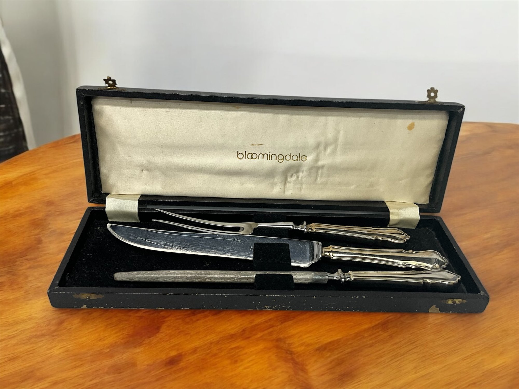 This Bloomingdale carving set is in its original box. The set has plated handles and stainless steel parts and was make in Sheffield, England. It includes a meat knife, a meat fork, and a knife sharpener. There are marks on the knife blade from being sharpened during the years- it is a vintage set, and is no longer available in the usual sites.