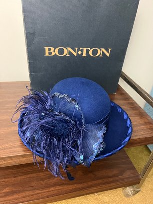 Beautifully made hat with a satin ribbon, sequined brim edge and an ornate feather fascinator.