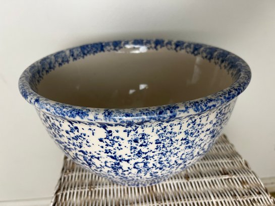 Charming country style blue and white spatterware mixing bowl with a single heart at the bottom of the bowl.