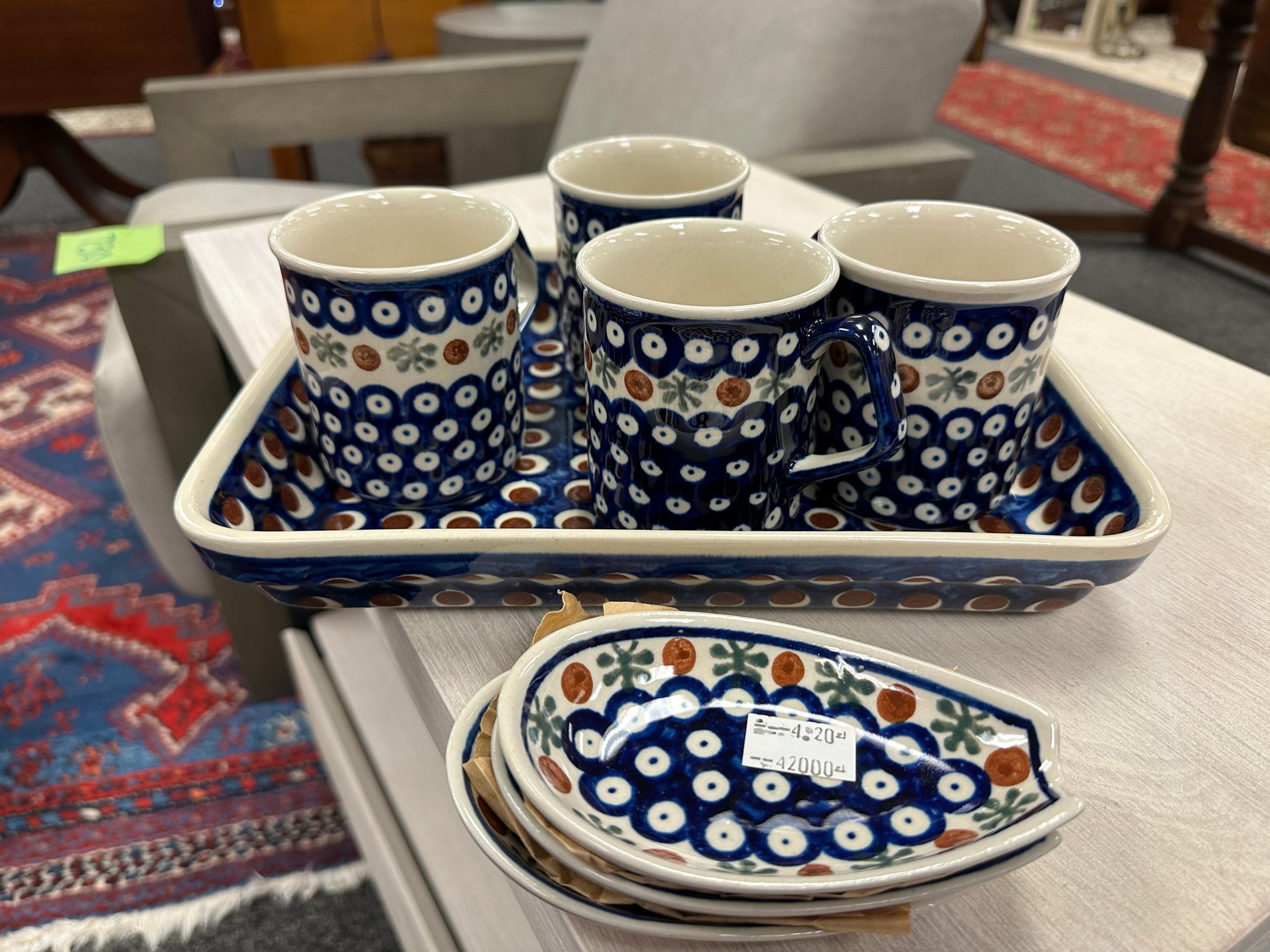 includes casserole dish, 4 mugs and 3 spoon rests blue and white Polish pottery commands a higher cost due to its handmade and unique craftsmanship. Each piece bears the weight of authenticity, showcasing individual styles with no automated production