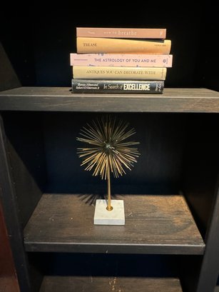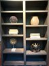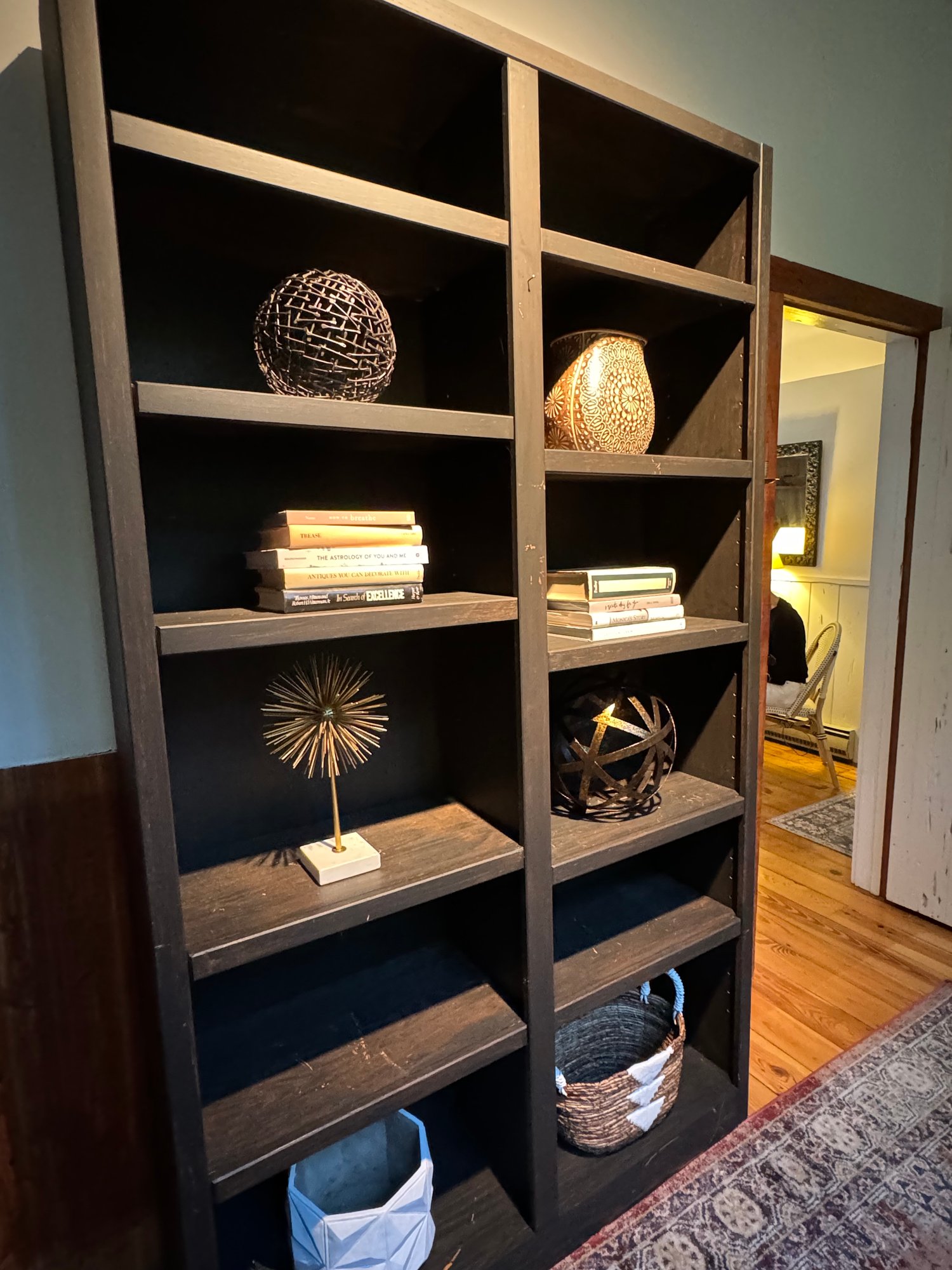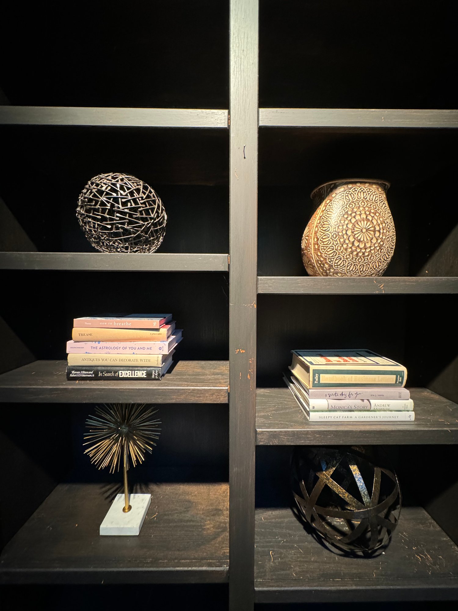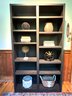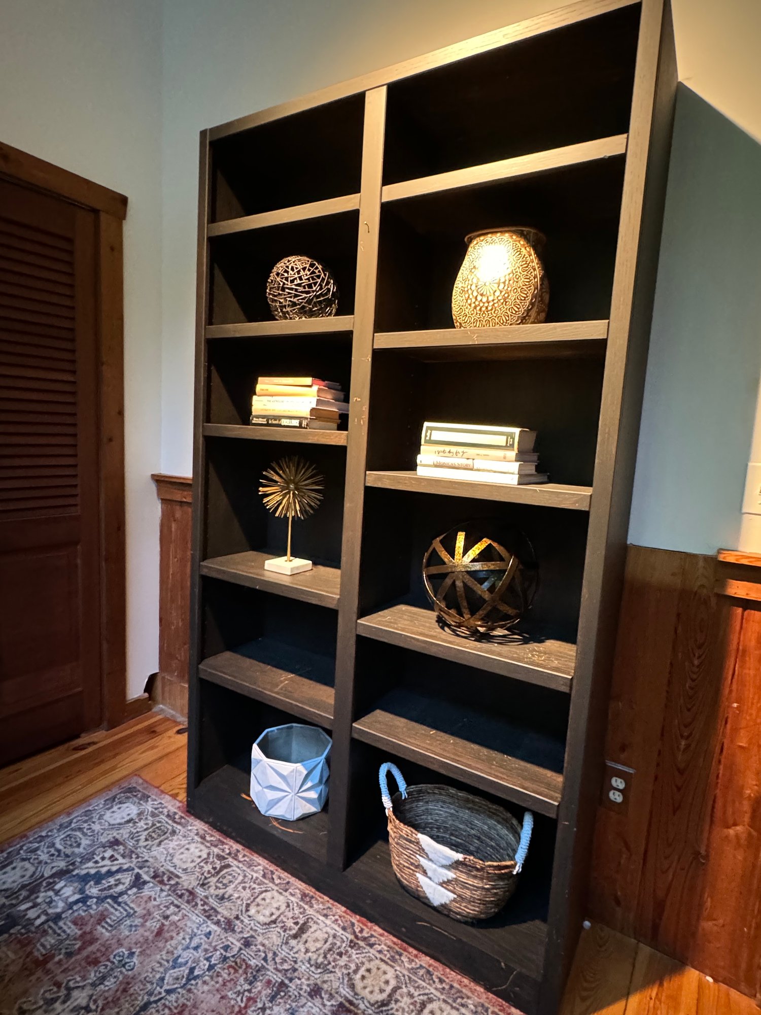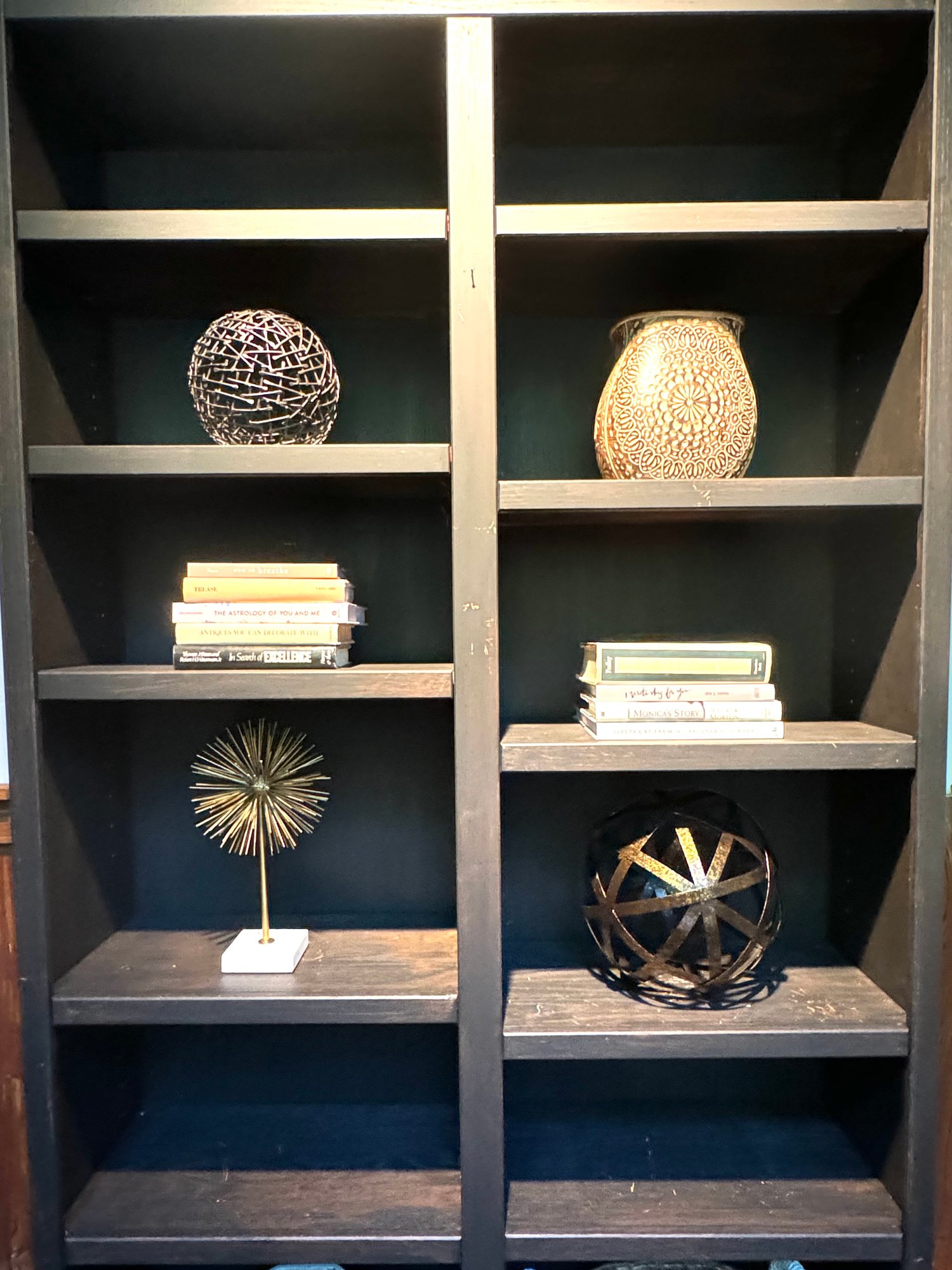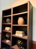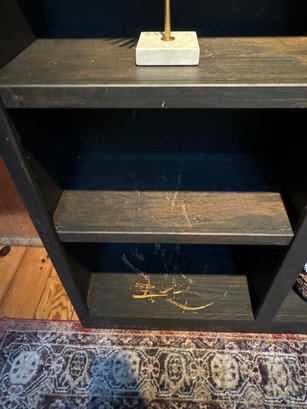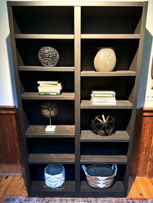 Tall Black bookshelf that includes all decor accessories shown on shelves. The shelf unit has finish nics & finish distress scuff marks. Can be used “as is “ or painted to cover. See all photos as they are considered part of the condition report.