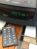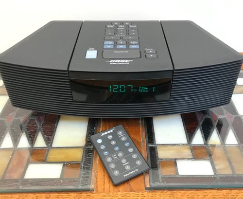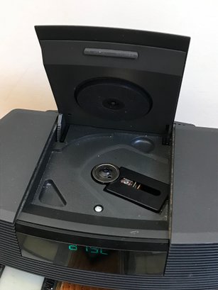 This is a classic Bose Wave Radio/CD (Model AWRC-1G) in a sleek graphite gray finish. Renowned for its "Waveguide" speaker technology, this unit delivers surprisingly rich, room-filling sound from a compact tabletop design. It features a top-loading CD player, integrated AM/FM tuner with digital display, and dual alarm clock functions.