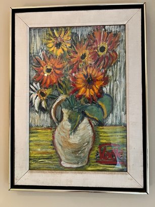 This is a mid-century modern oil painting, titled Bouquet de fleurs, signed by the artist Pierre Gille.