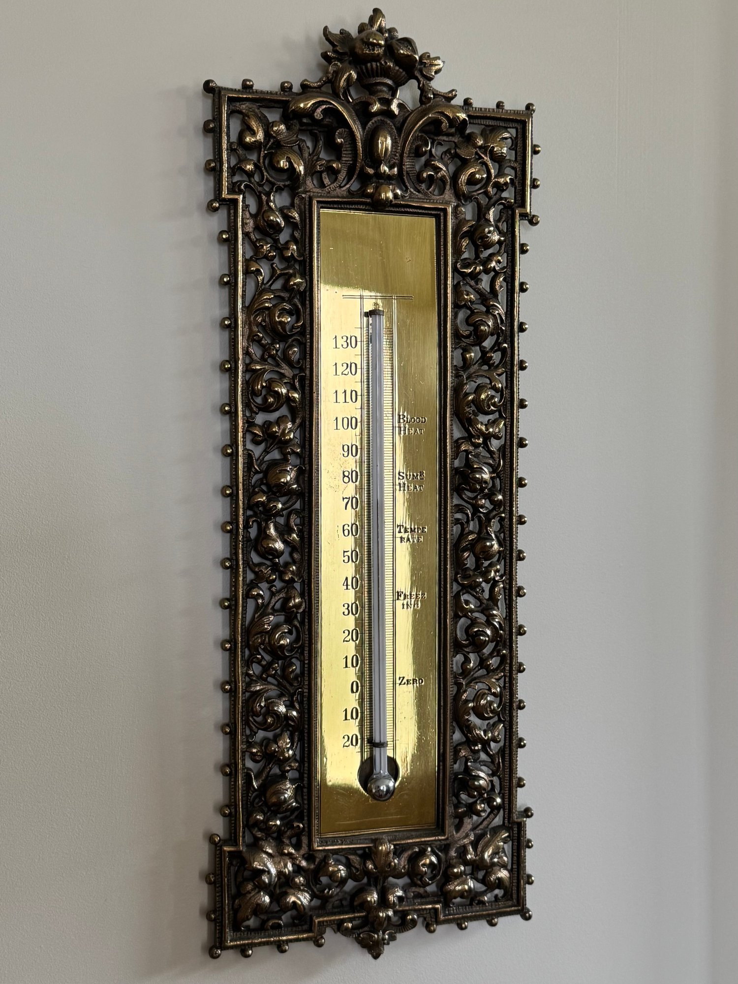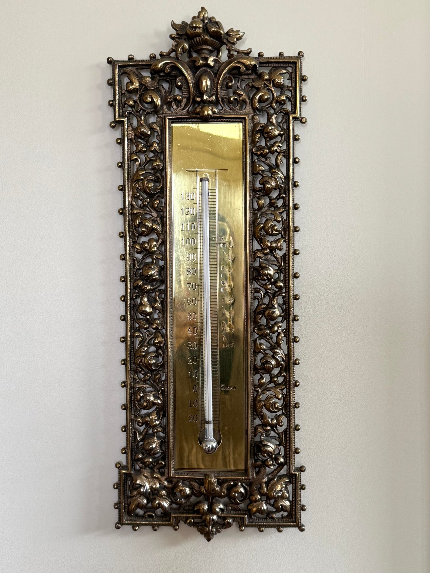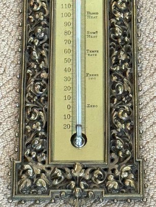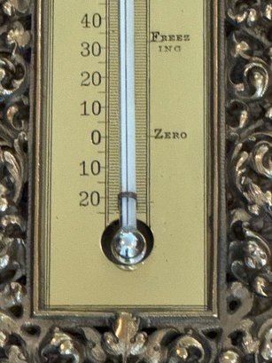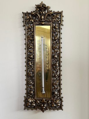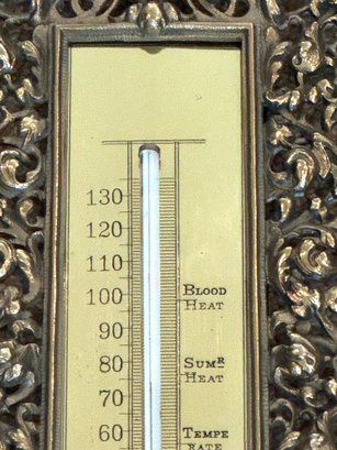 This charming vintage thermometer was purchased out of Southampton antique store and was said by the shop to be Bradley Hubbard, although there is no marking. Note that in person it is very bright shiny brass surrounded by open design. In very good condition. Size 15.5 H x 5.5 W