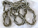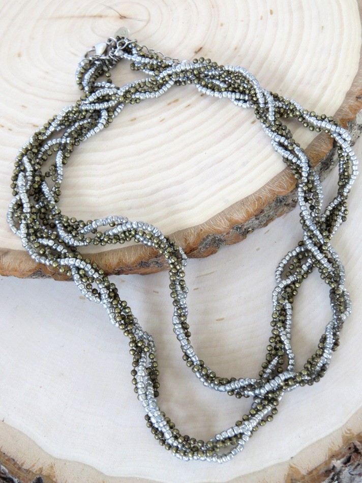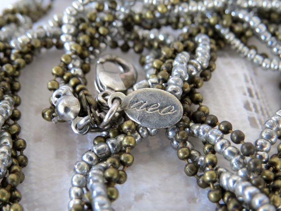 This designer necklace by AEO features metal seed beads in the tones of silver and bronze braided together to create a 32" necklace. Necklace has a working lobster claw clasp and an extender to adjust the necklace from 32" -34". Necklace has a metal tag marked AEO.