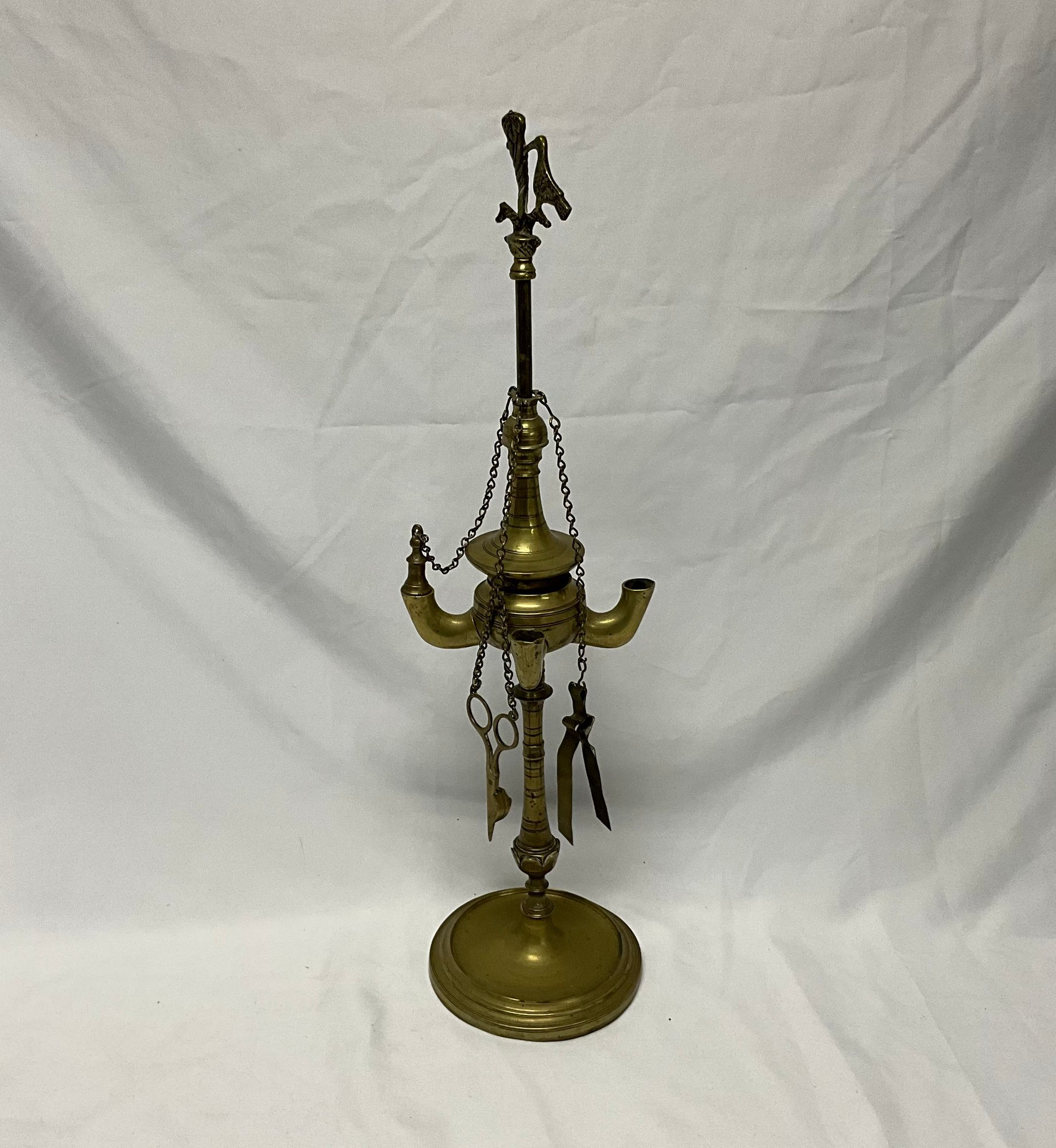 Solid brass, 21 1/2" tall, four spouts for the oil wicks. Three tools hang from the neck: scissors, tongs, and snuffer. The finial is a woodpecker on a tree trunk.