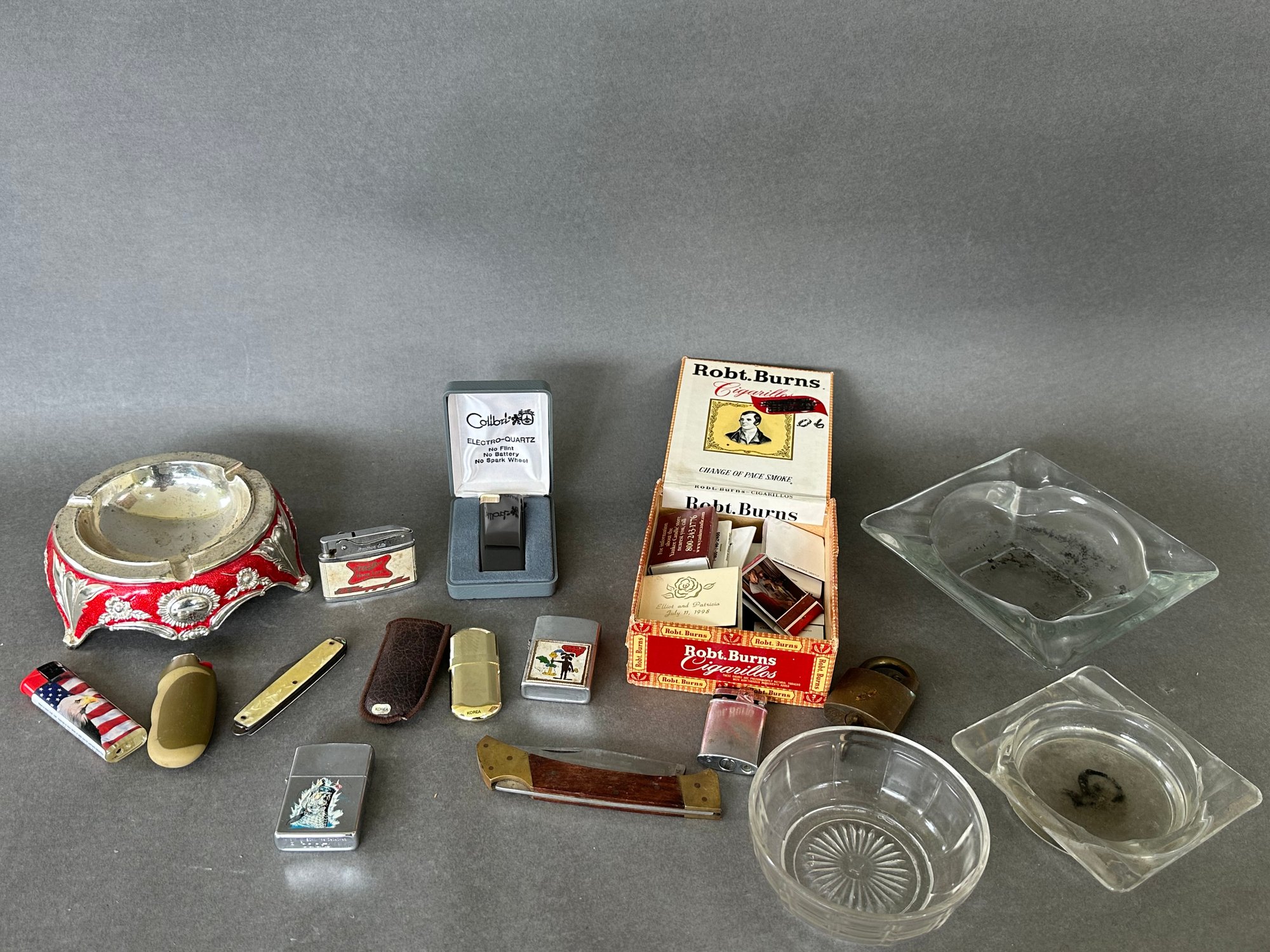 A pretty collection of lighters including a brass Marlboro Lighter and electro quartz lighter, pocket knives, zippos, ashtrays and more. Check out that beautiful metal ash tray.