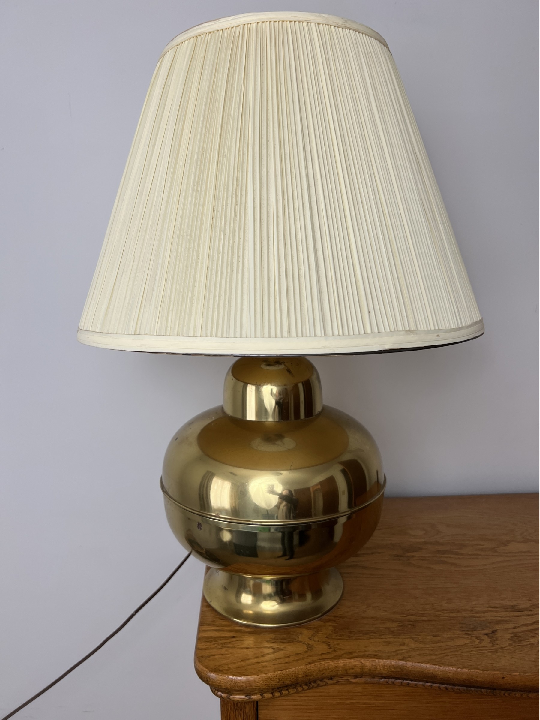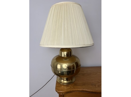 Round brass finish table lamp with an off-white pleated bell shade.