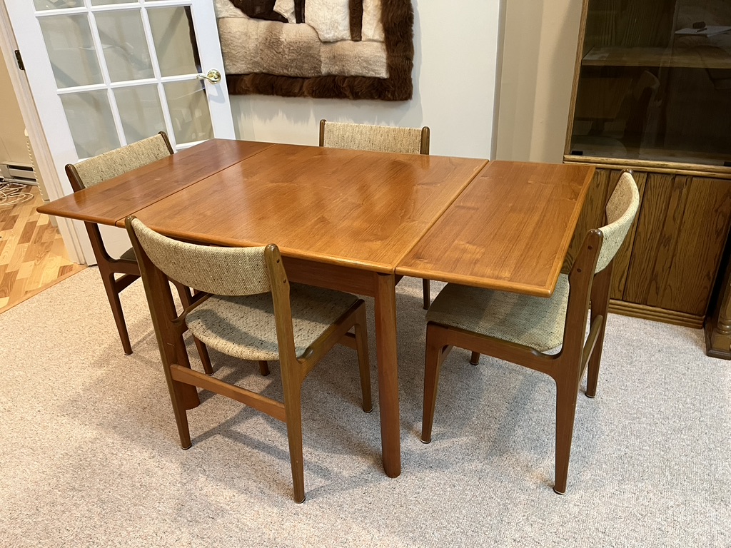 Teak table with inclosed extensions , photographed both ways. When extensions are pushed in it measures 35.25 x35.25x28.5.
