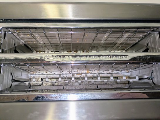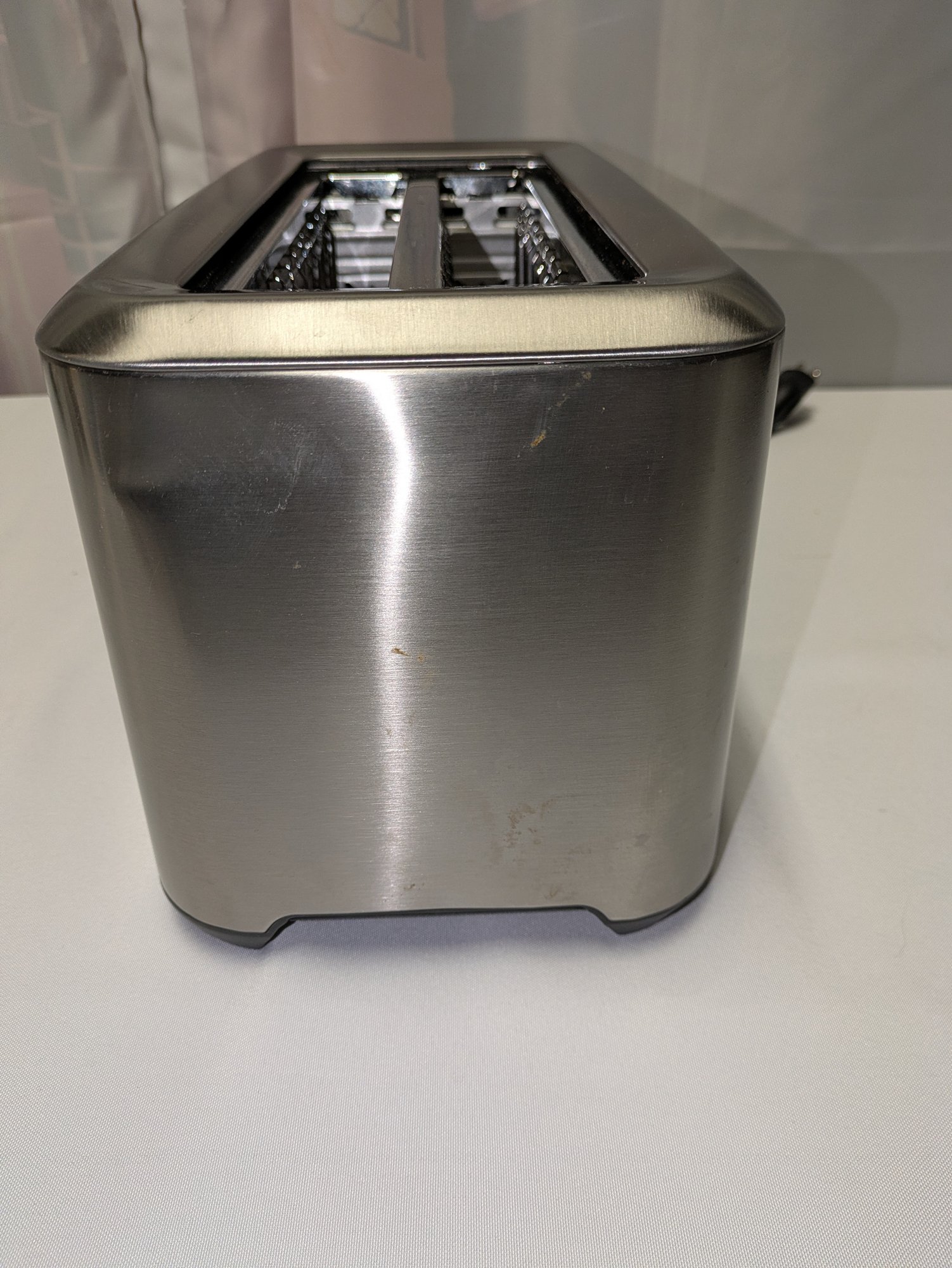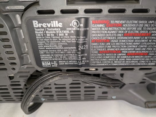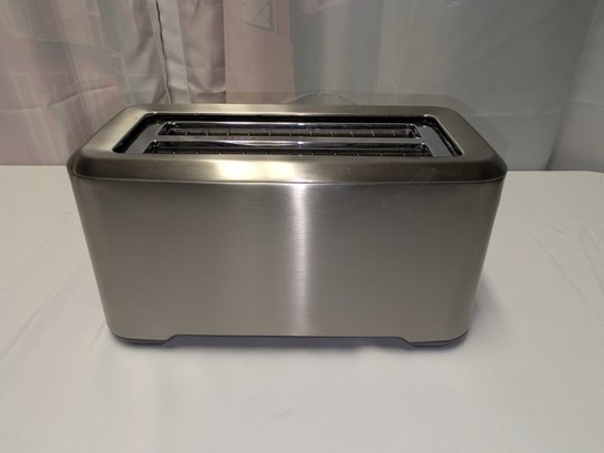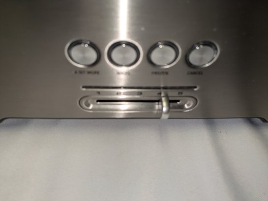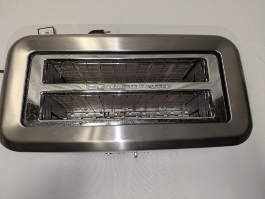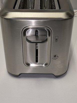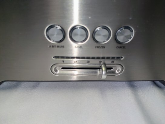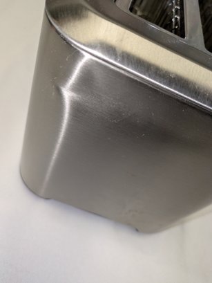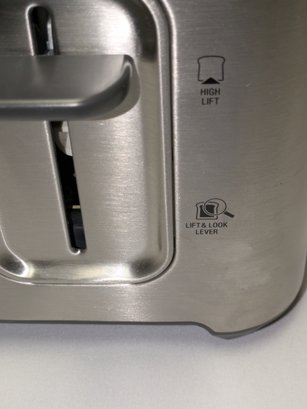 Includes settings for bagels and frozen items, along with a "A Bit More" button to add 30 seconds of extra toasting time. Features a brushed stainless steel exterior and wide, long slots to accommodate various bread sizes. "Lift & Look" lever to check progress without interrupting the cycle, and a slide-out crumb tray for easy cleaning. Some light marks and a dent on the back side, consistent with age, use, and movement. Overall, Very Good Working Condition. Please see all photos as part of the description and condition. 8"H x 7" x 15"