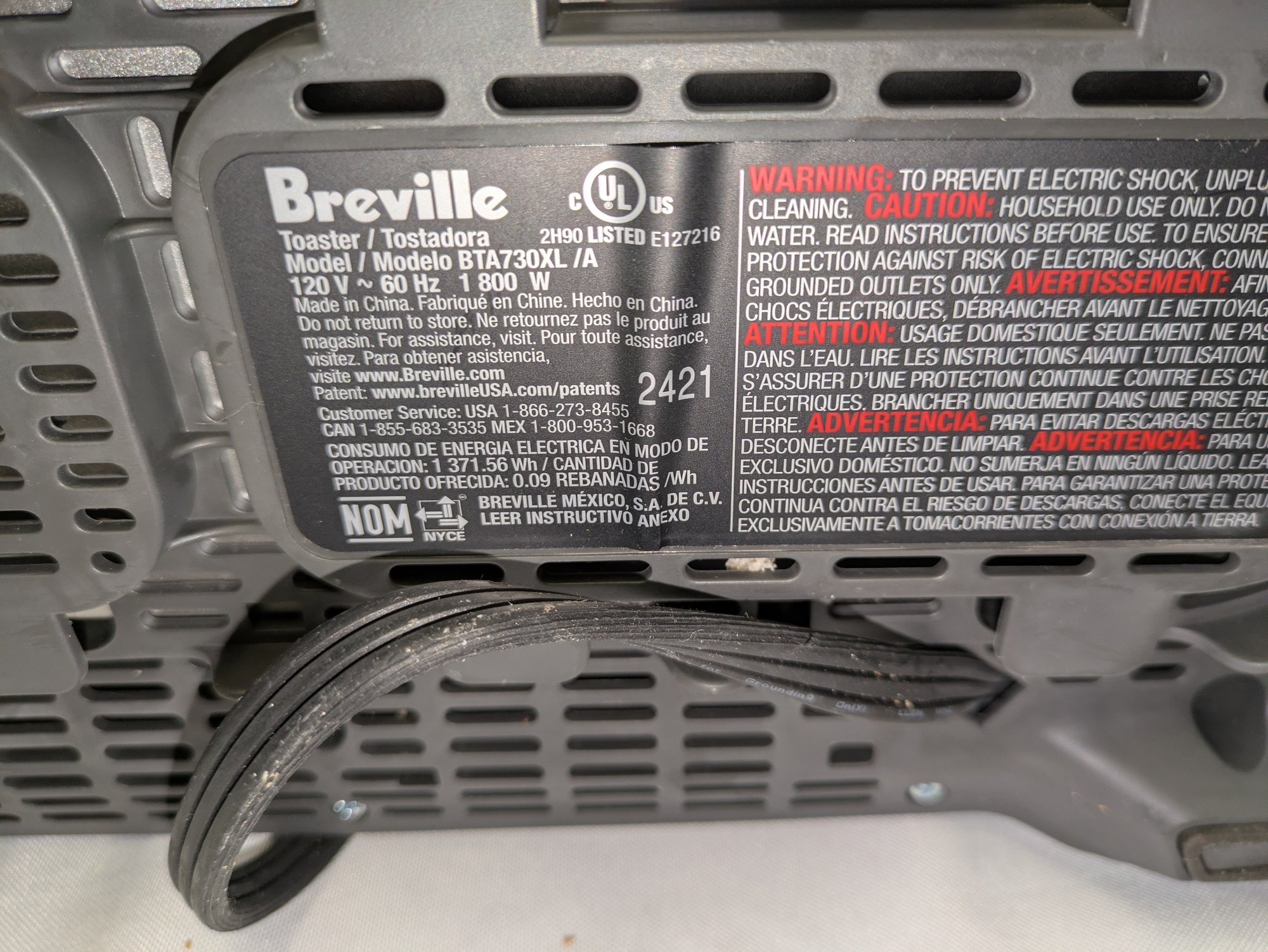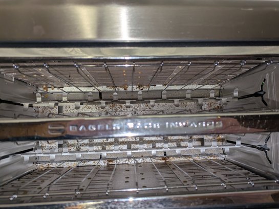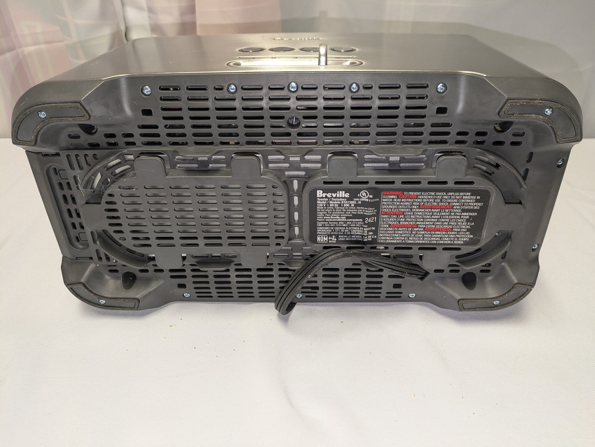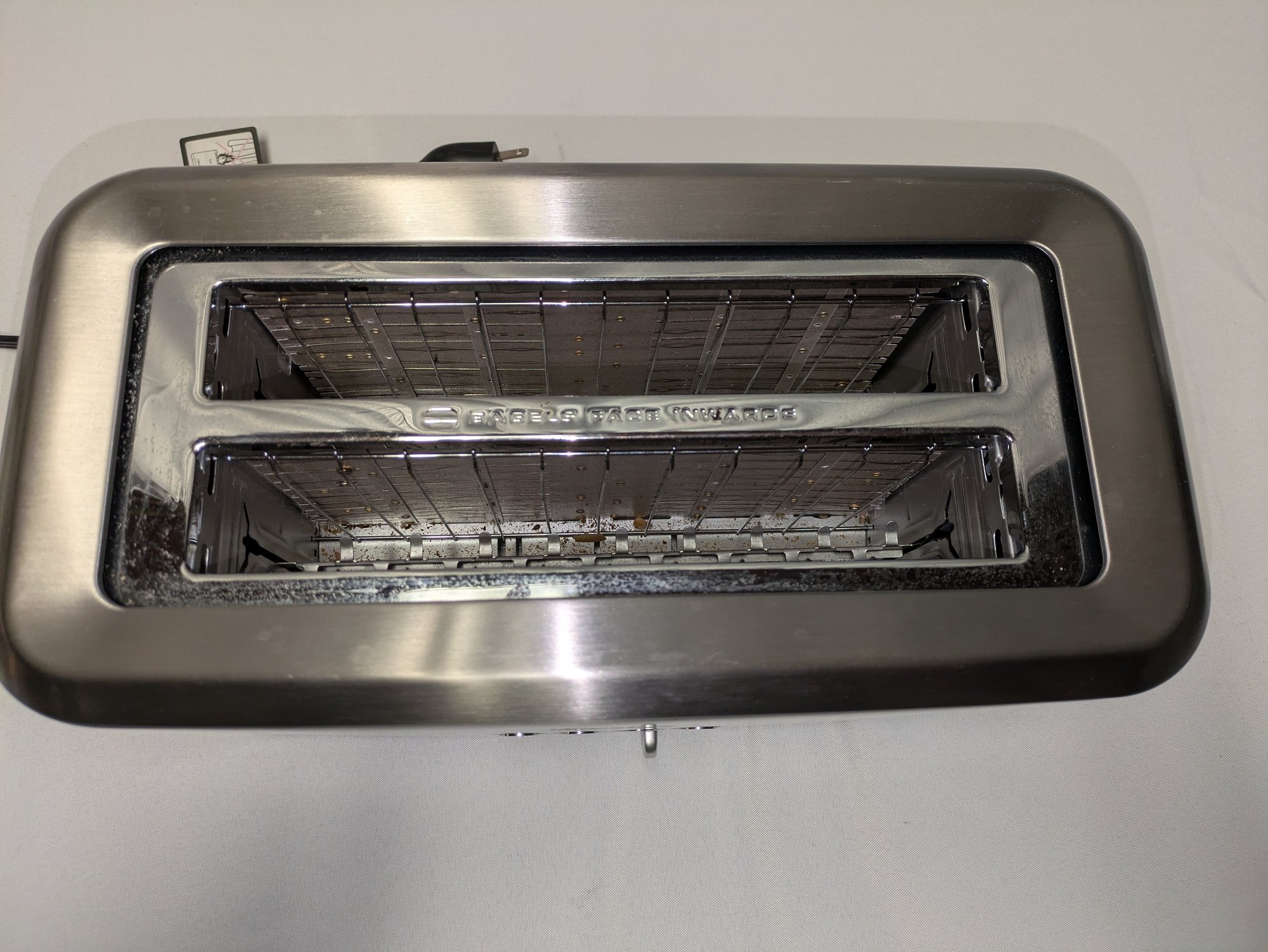 Includes settings for bagels and frozen items, along with a "A Bit More" button to add 30 seconds of extra toasting time. Features a brushed stainless steel exterior and wide, long slots to accommodate various bread sizes. "Lift & Look" lever to check progress without interrupting the cycle, and a slide-out crumb tray for easy cleaning. Some light marks and a dent on the back side, consistent with age, use, and movement. Overall, Very Good Working Condition. Please see all photos as part of the description and condition. 8"H x 7" x 15"