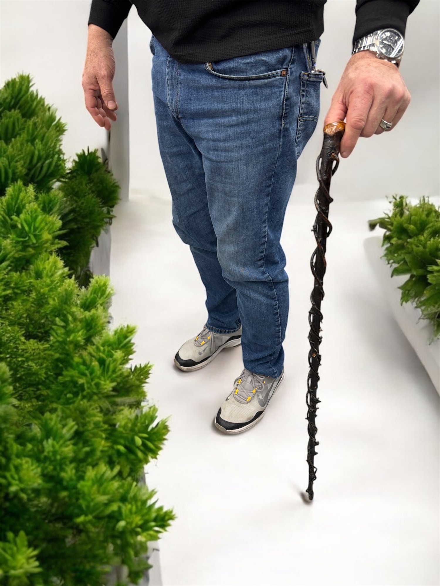 Vintage walking stick made of briar wood, and wrapped with briar vine. The thorns remain on the vine, though they have been blunted. The metal cap on the foot of the cane is loose, and one end of the vine has lost an inch or two so no longer fits under the end cap, but it is close to the cane.