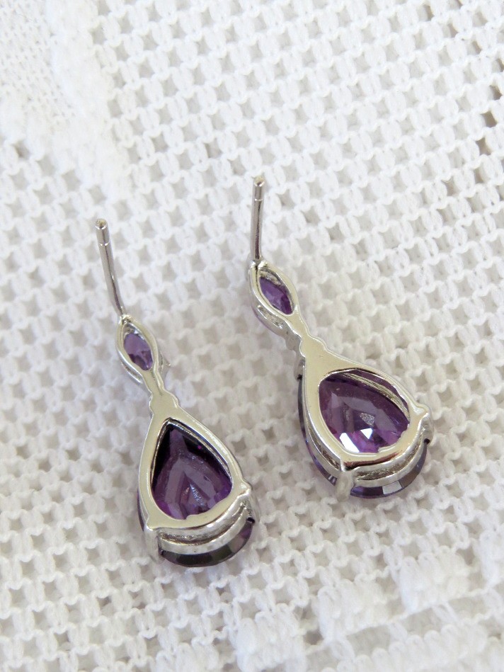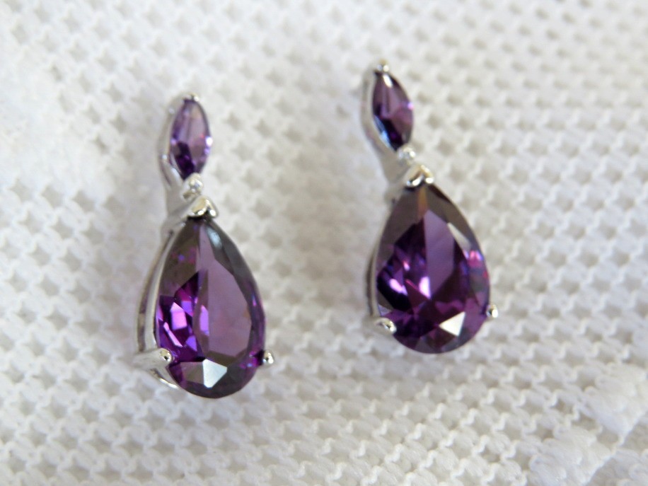 Faceted crystal stud earrings in a brilliant purple amethyst color. Earrings are set in a shiny silver tone finish with a 3/8" long pear shaped crystal and a 1/4" long marquise shaped crystal.