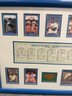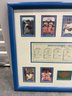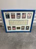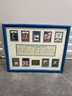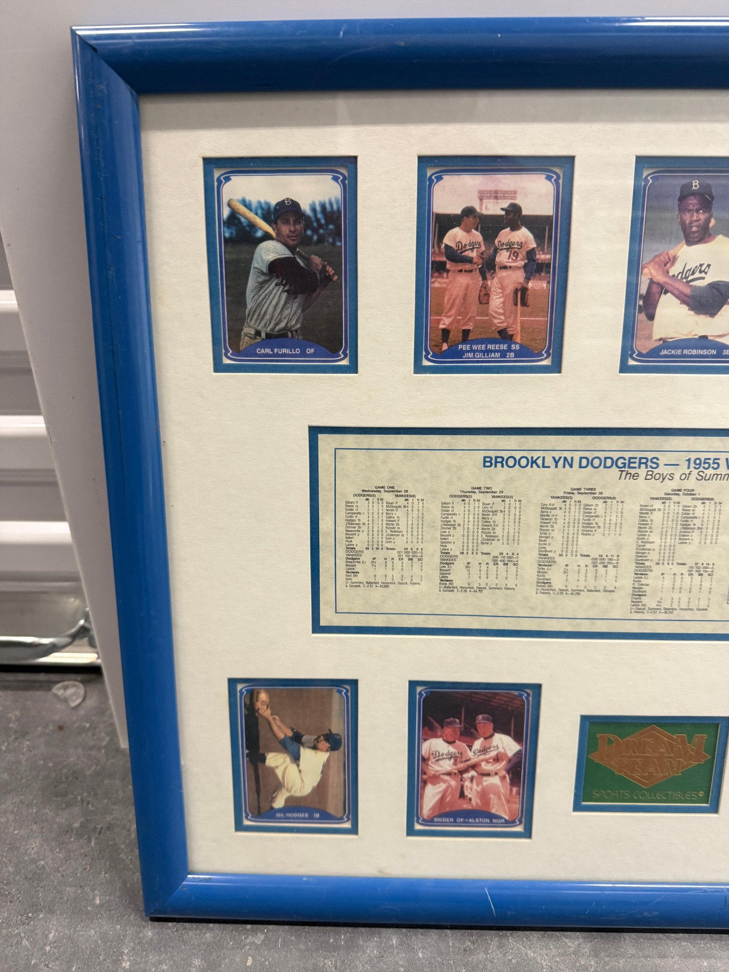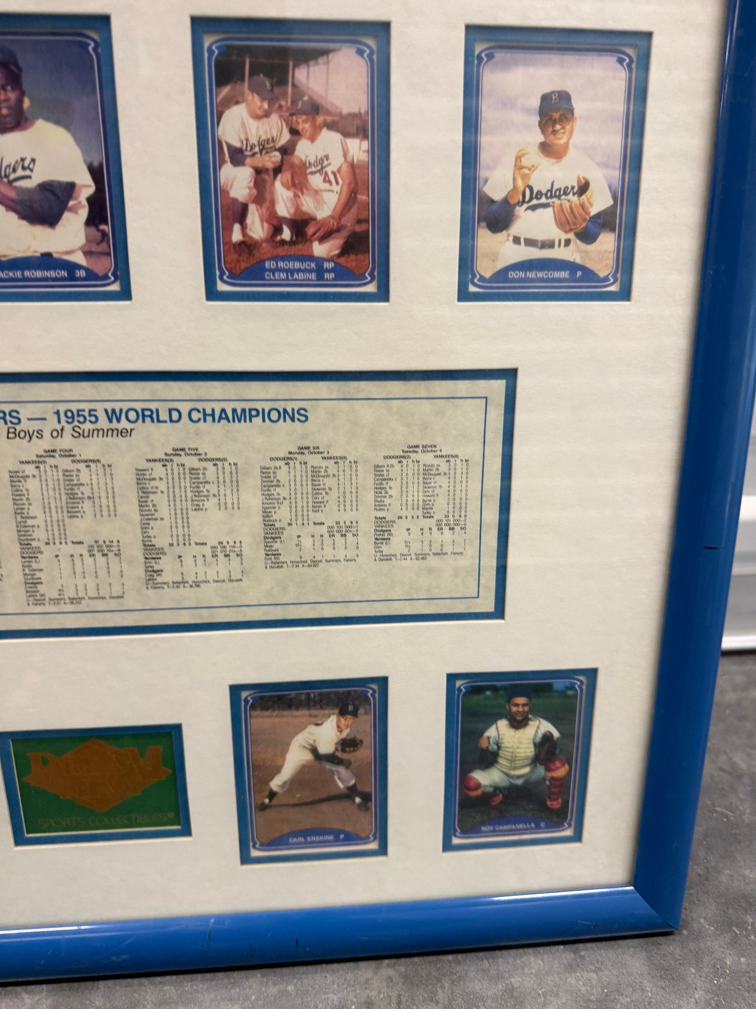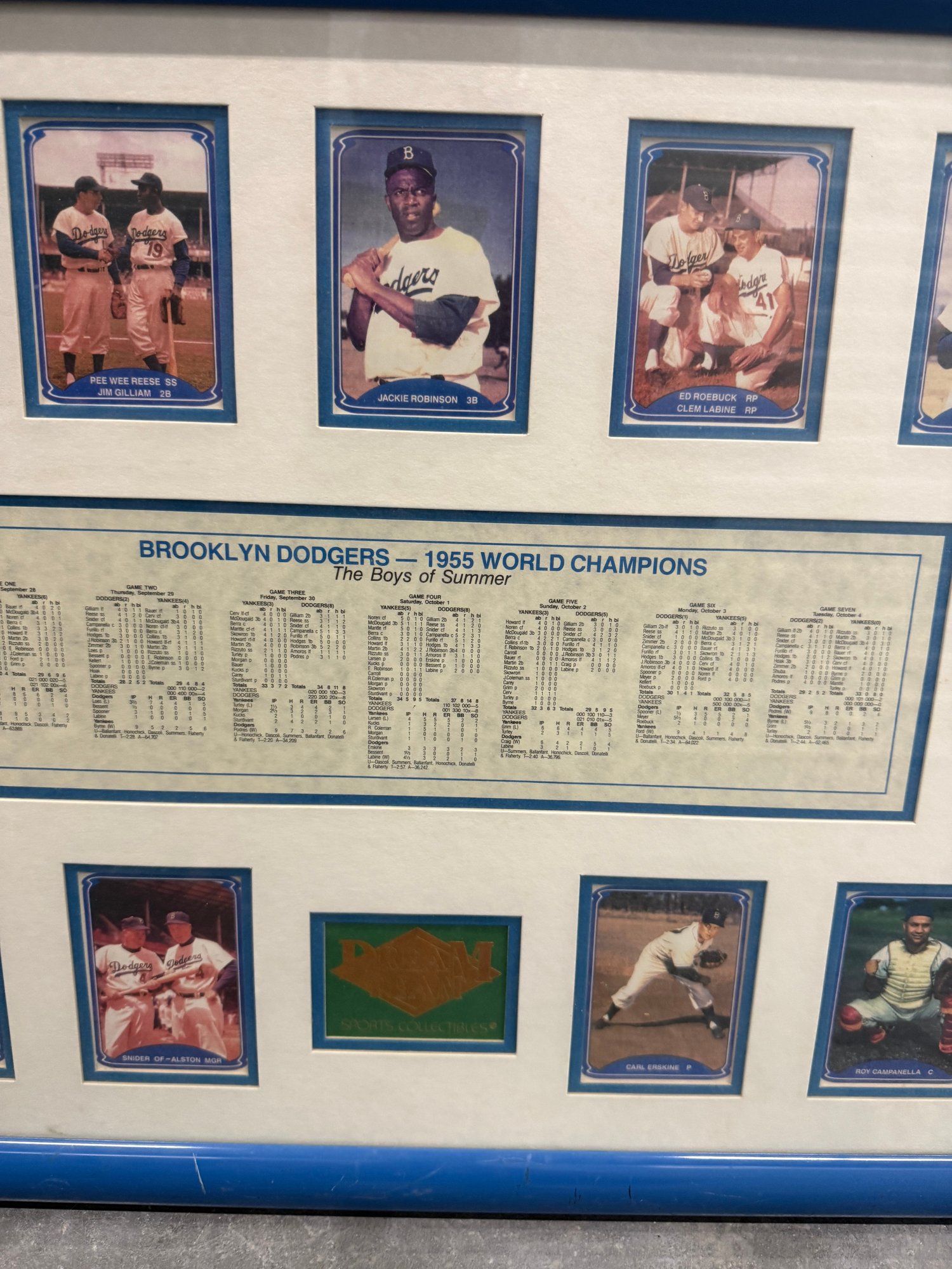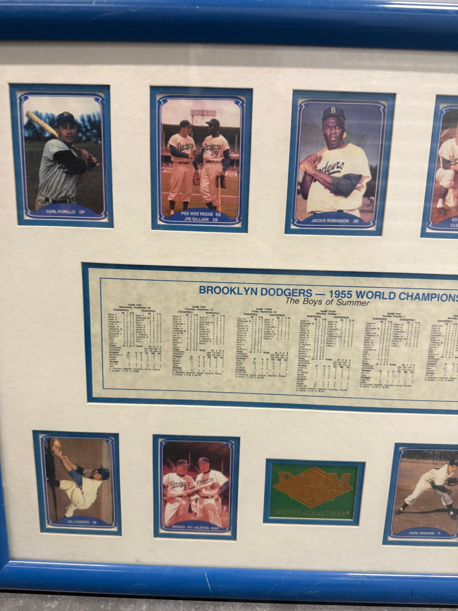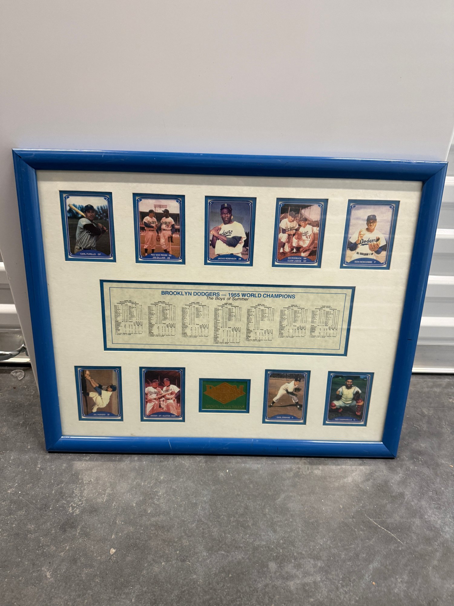 Framed Brooklyn Dodgers commemorative display celebrating the 1955 World Championship season, featuring player images including Jackie Robinson along with team statistics and game results from the championship series. This decorative sports memorabilia piece showcases the historic team widely known as “The Boys of Summer” and highlights one of baseball’s most iconic eras. The display includes multiple reproduction player cards and printed statistical panels, professionally arranged and housed in a blue frame. Frame shows some wear consistent with age but overall presents well. A great collectible display piece for Dodgers fans or baseball memorabilia enthusiasts.