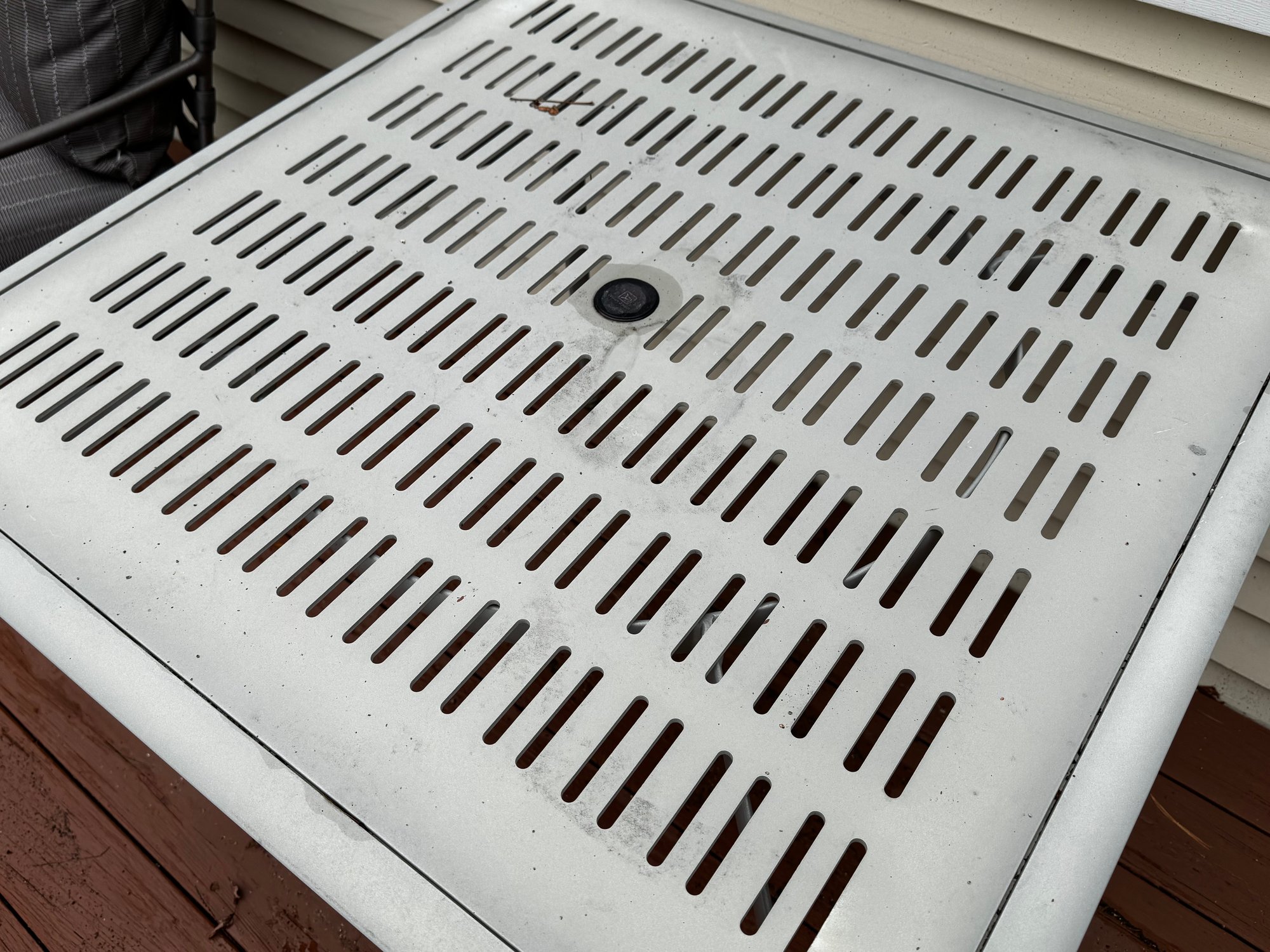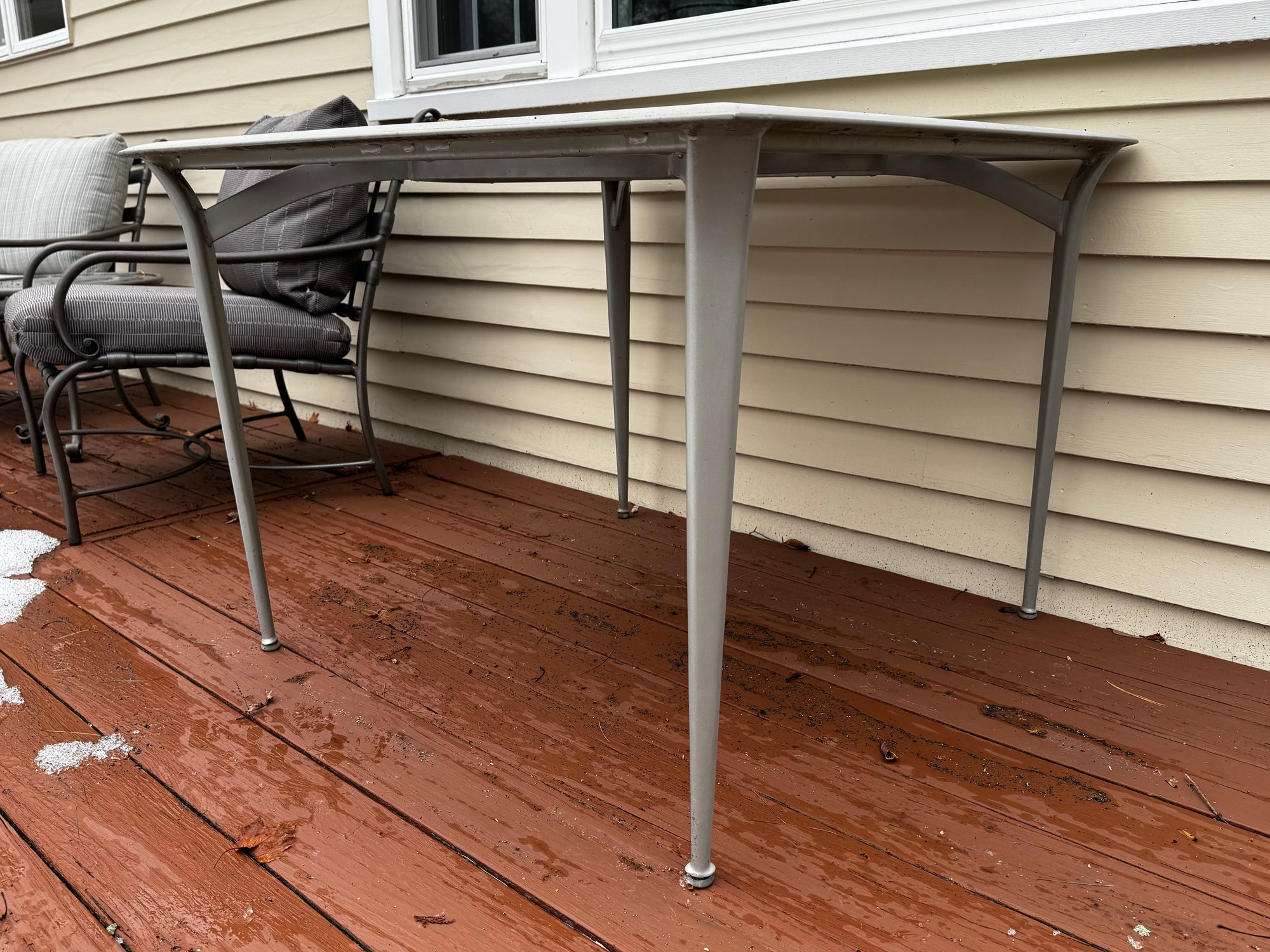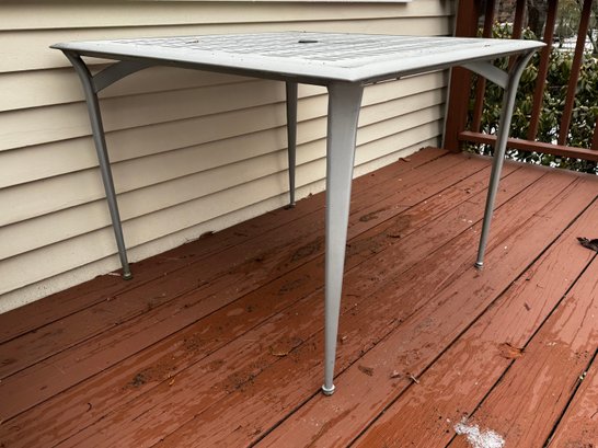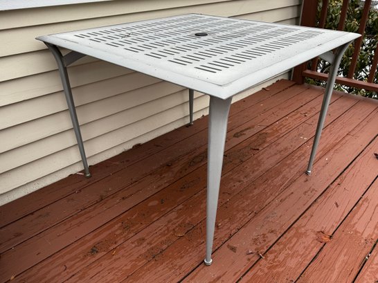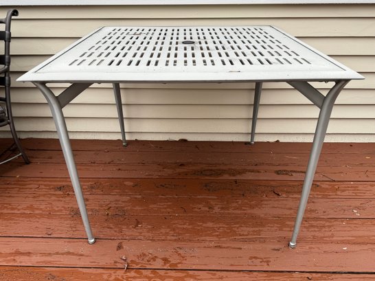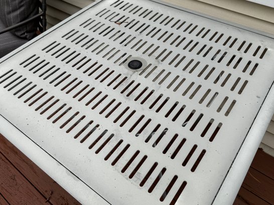 Slightly worn from exposure, but this luxe outdoor furniture is made to last - the table can accommodate an umbrella with stand.