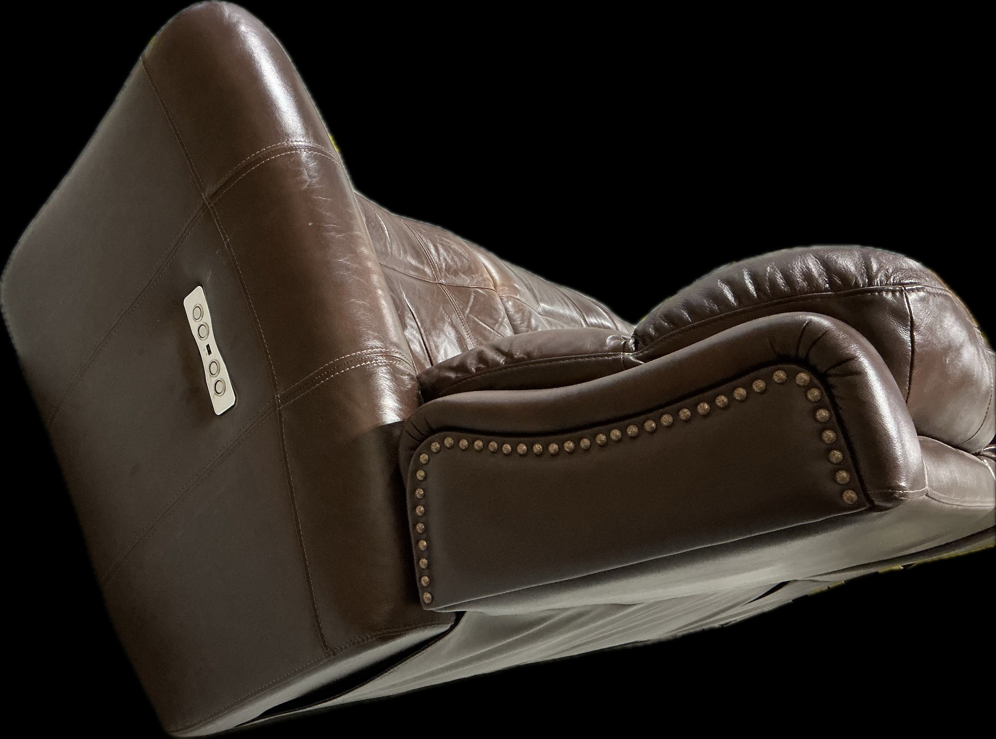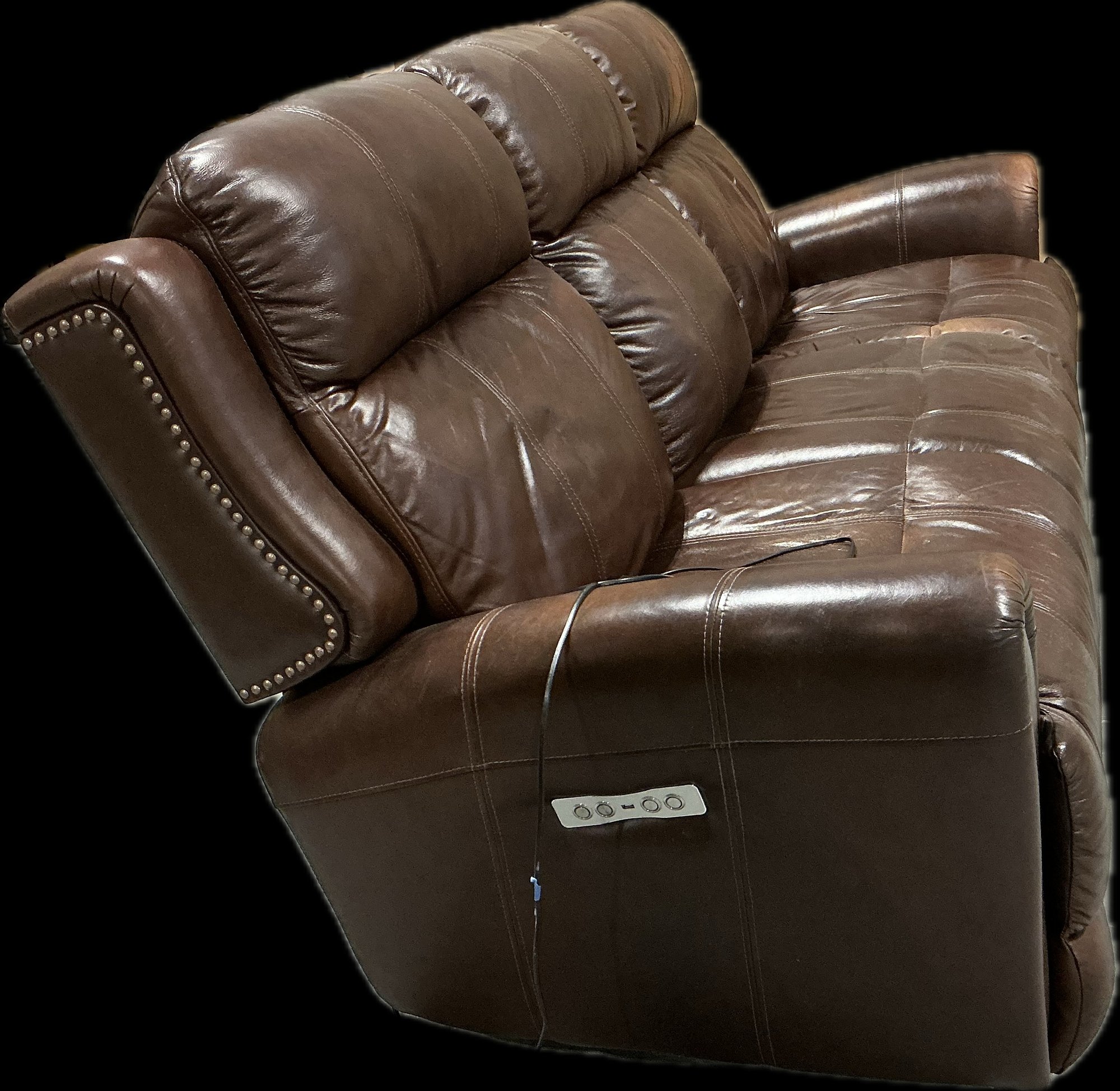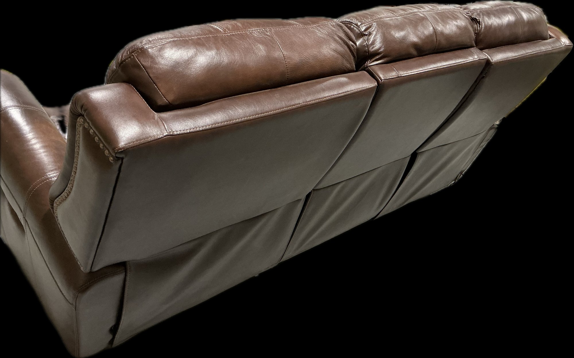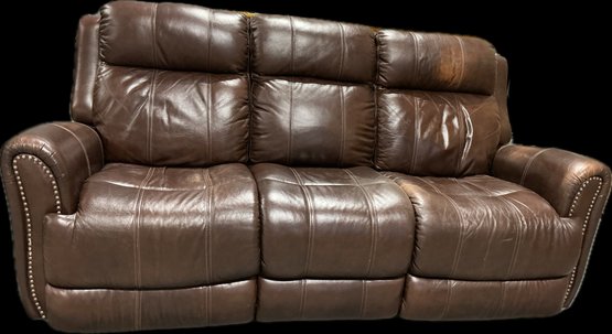 Oversized brown leather reclining sofa featuring three generously padded seats with plush channel-stitched backs, rolled arms trimmed with decorative nailhead accents, and smooth reclining mechanisms for deep comfort; upholstered in rich brown leather with natural creasing and wear consistent with normal use, including visible patina, surface wrinkles, and minor scuffs that add to its lived-in character; sturdy frame, wide armrests, and substantial profile make this an ideal family room or den piece; recliners function smoothly