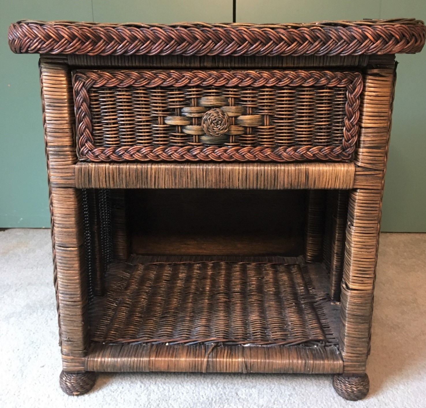 Great little dark brown wicker nightstand/side table with one drawer and a bottom shelf. It's in good condition with minor finish loss and measures 22.25 inches tall x 19 inches wide x 17.75 inches deep.