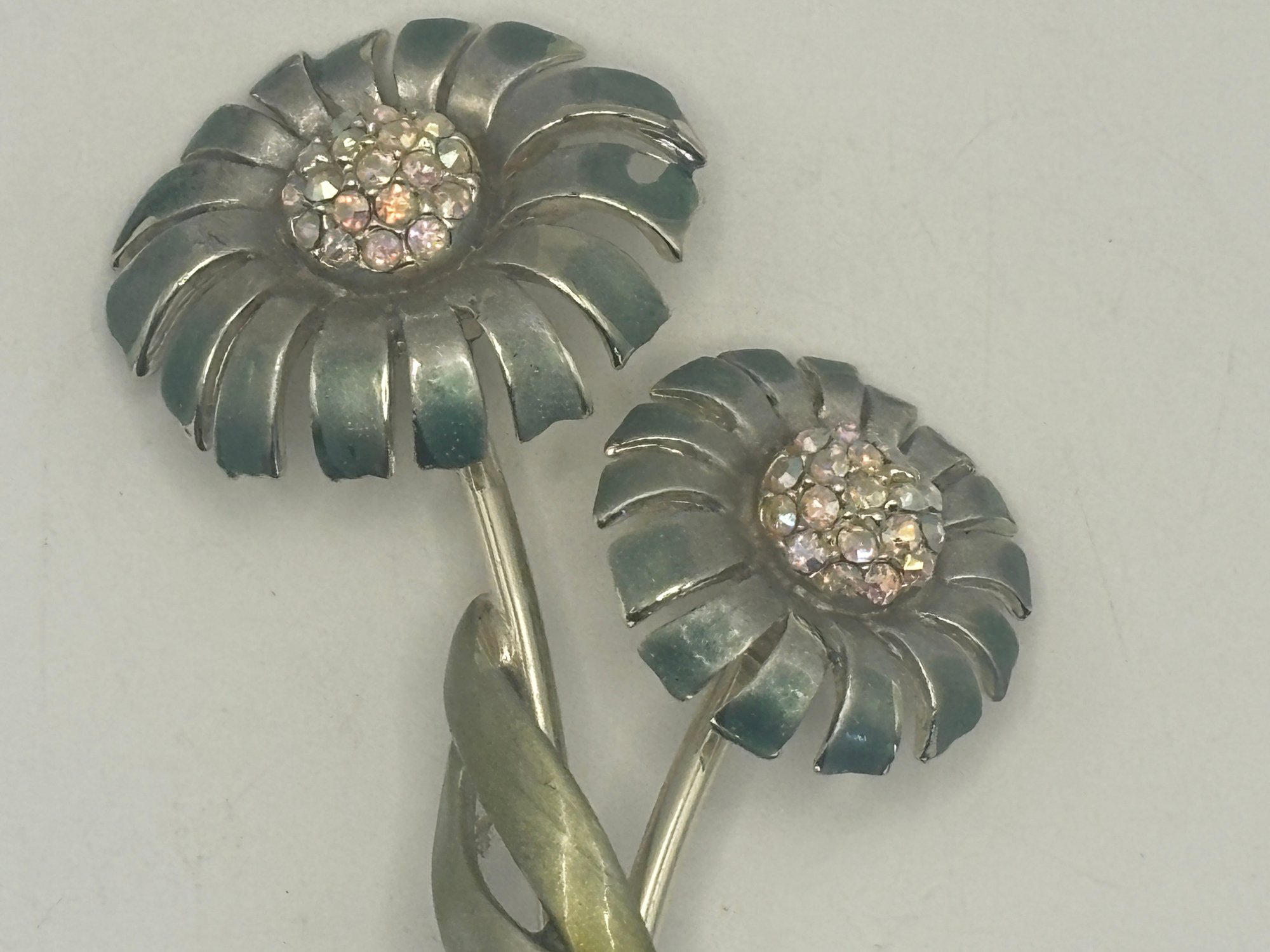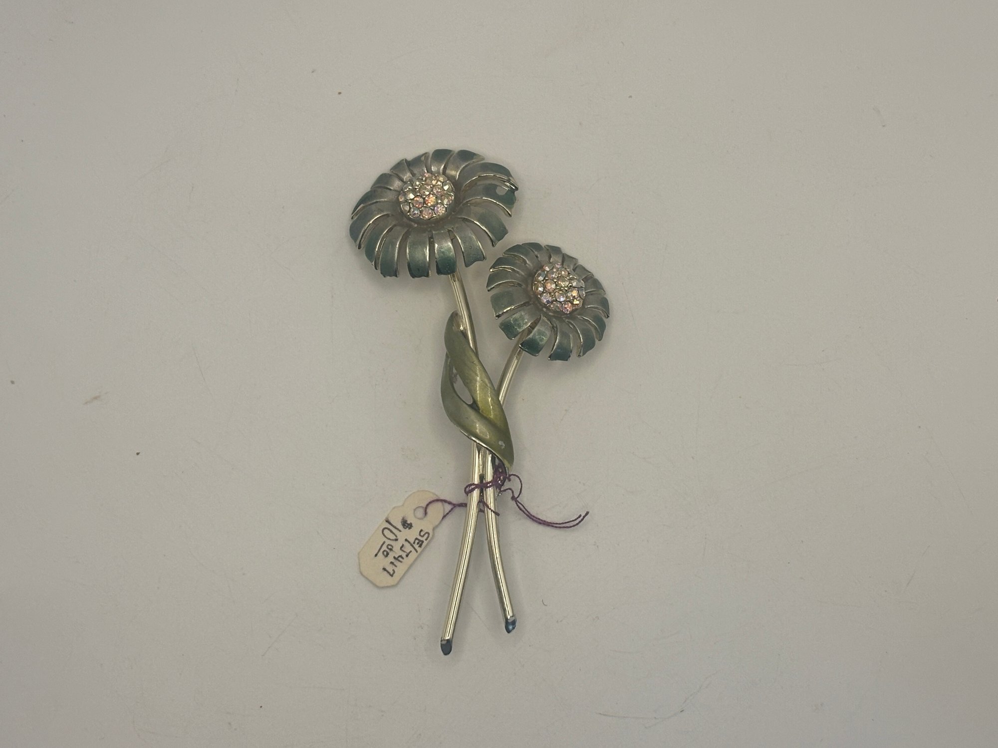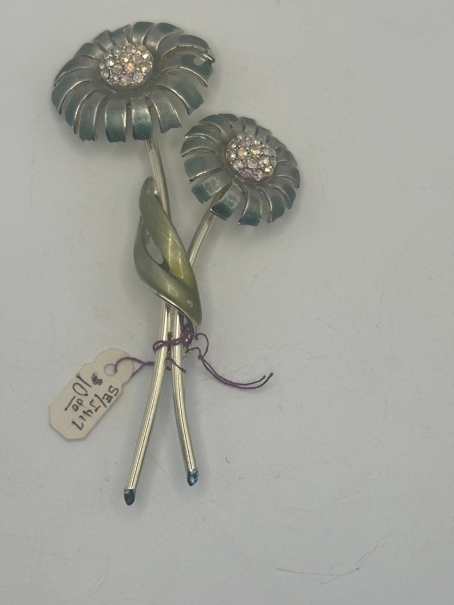 A lovely mid-century floral brooch by BSK featuring two stylized flowers with curved petal detailing and sparkling rhinestone centers. The petals are finished in soft green enamel tones, complemented by sleek silver-tone stems and a dimensional twisted leaf accent at the center. An original mid-century price tag remains attached, adding a nice layer of collectibility and charm.