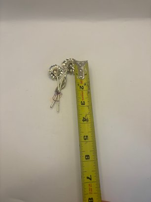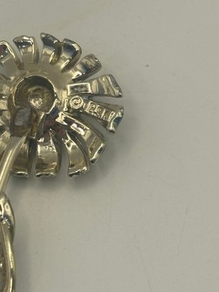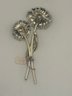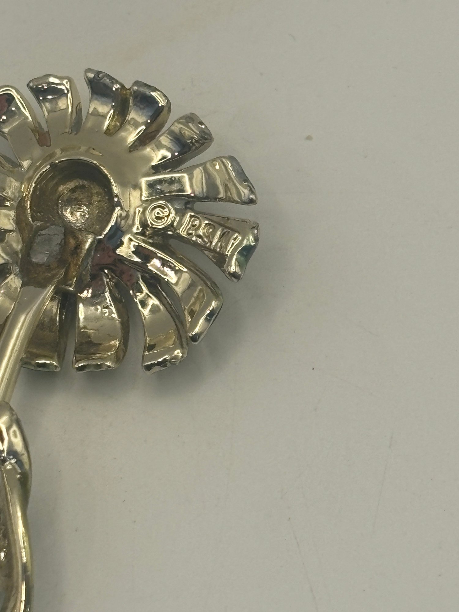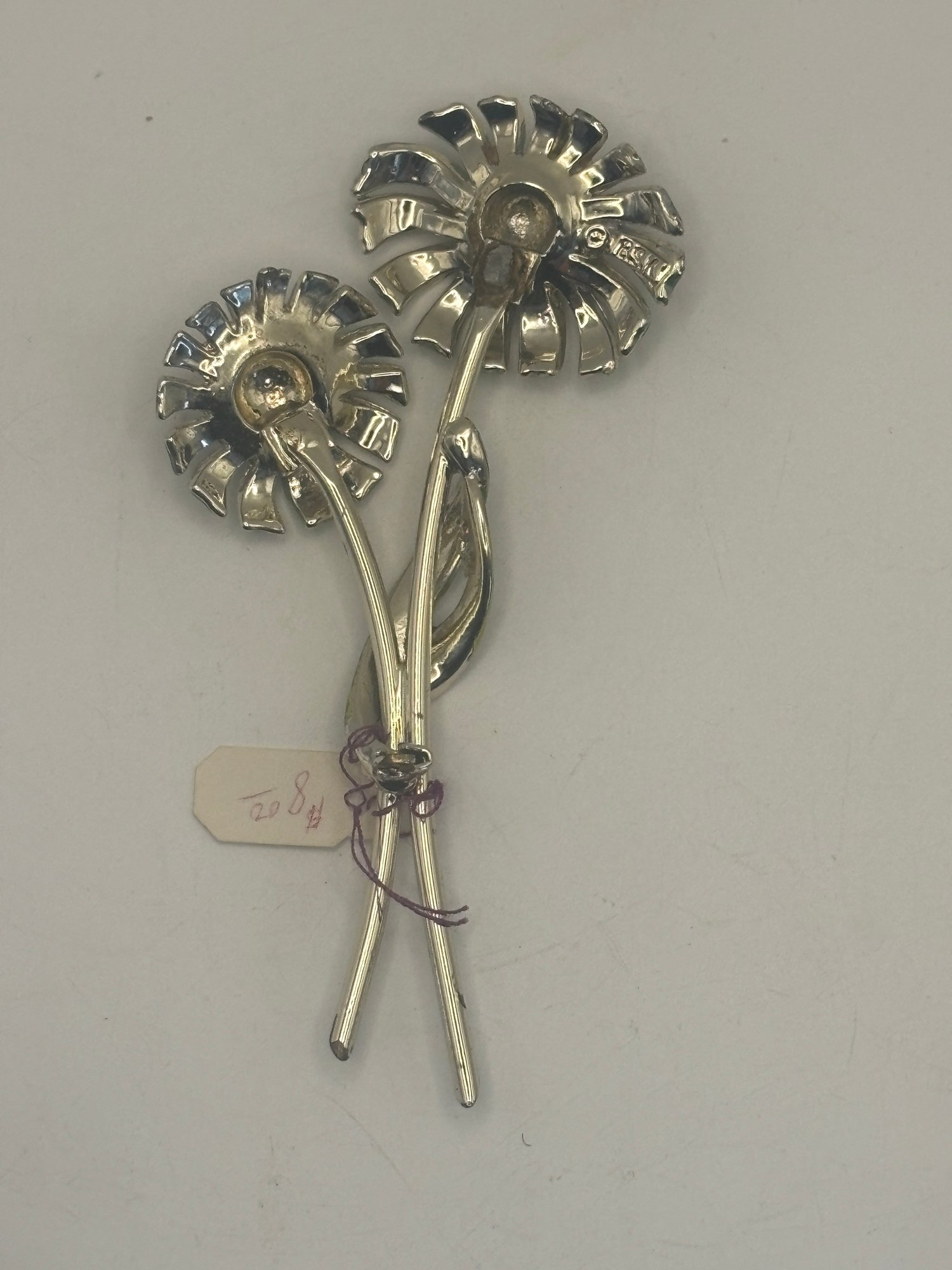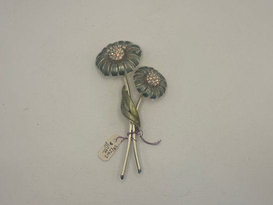 A lovely mid-century floral brooch by BSK featuring two stylized flowers with curved petal detailing and sparkling rhinestone centers. The petals are finished in soft green enamel tones, complemented by sleek silver-tone stems and a dimensional twisted leaf accent at the center. An original mid-century price tag remains attached, adding a nice layer of collectibility and charm.