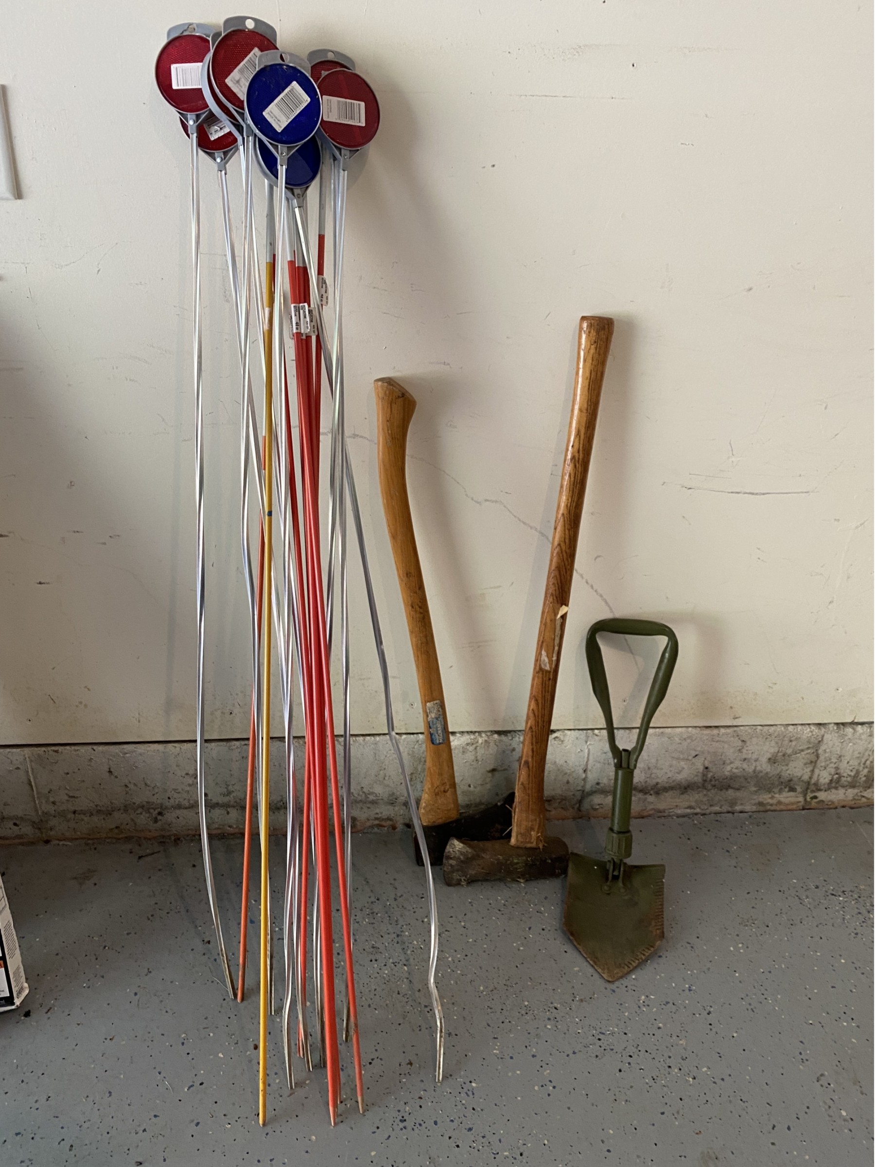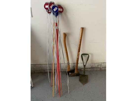 Axes and folding metal shovel have heavy surface wear and tear throughout. See all photos for details on condition.