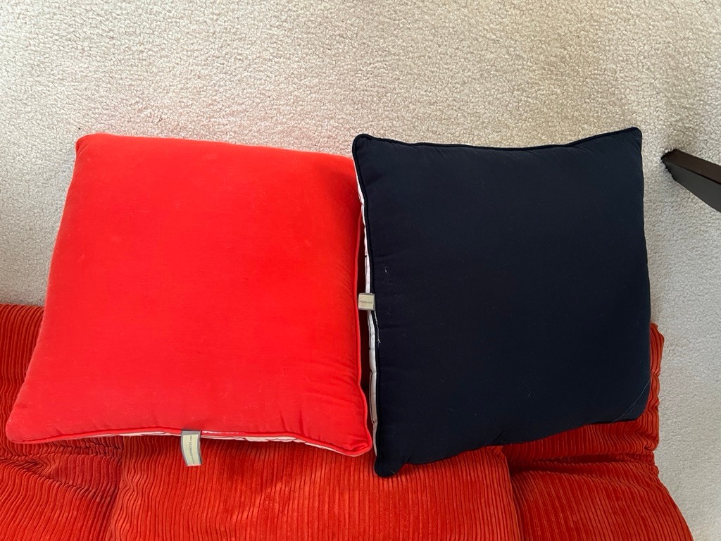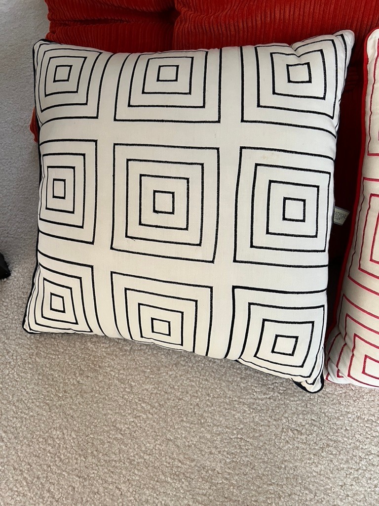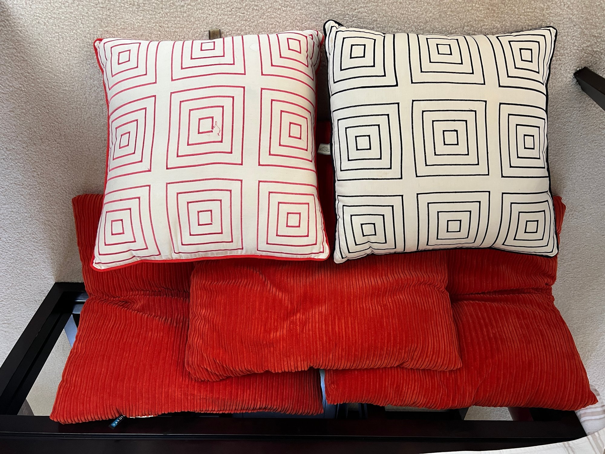 Burnt orange/red Velour fabric pillows, with black & beige and red and beige additional side pillows