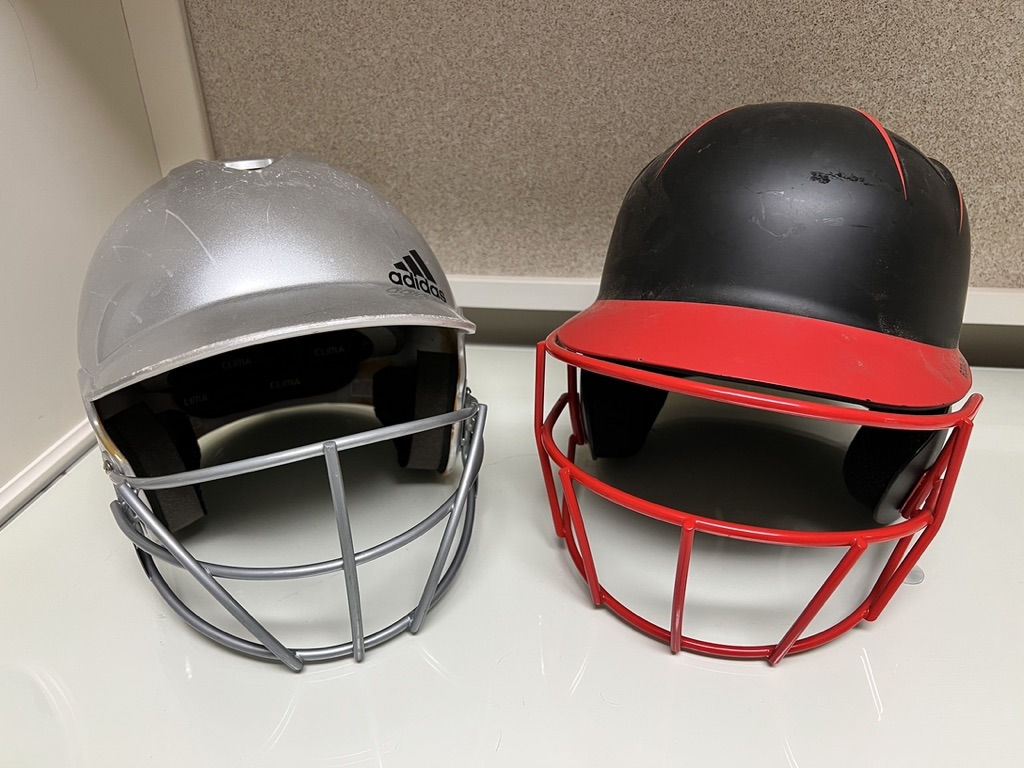 Caged softball helmets, 1 in red, black, and silver, the other in silver