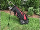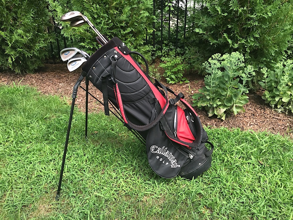 Callaway red and black golf bag with 2 drivers and 4 irons.