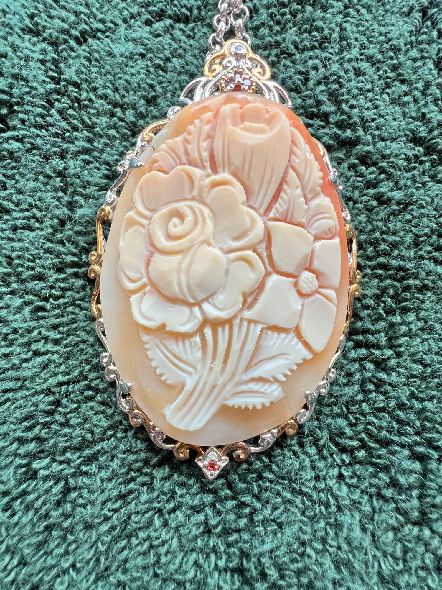 Cameo In Sterling Silver On 19" Chain, Accented With Garnets
