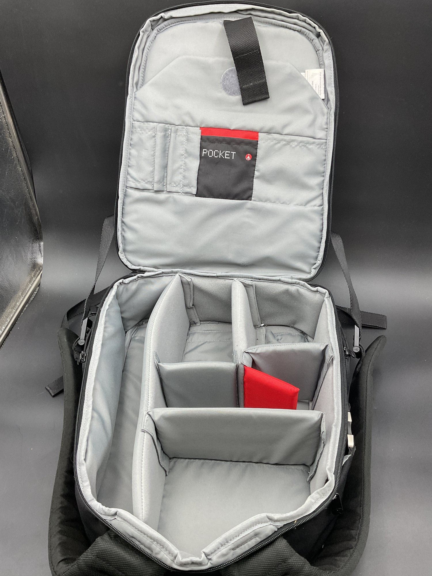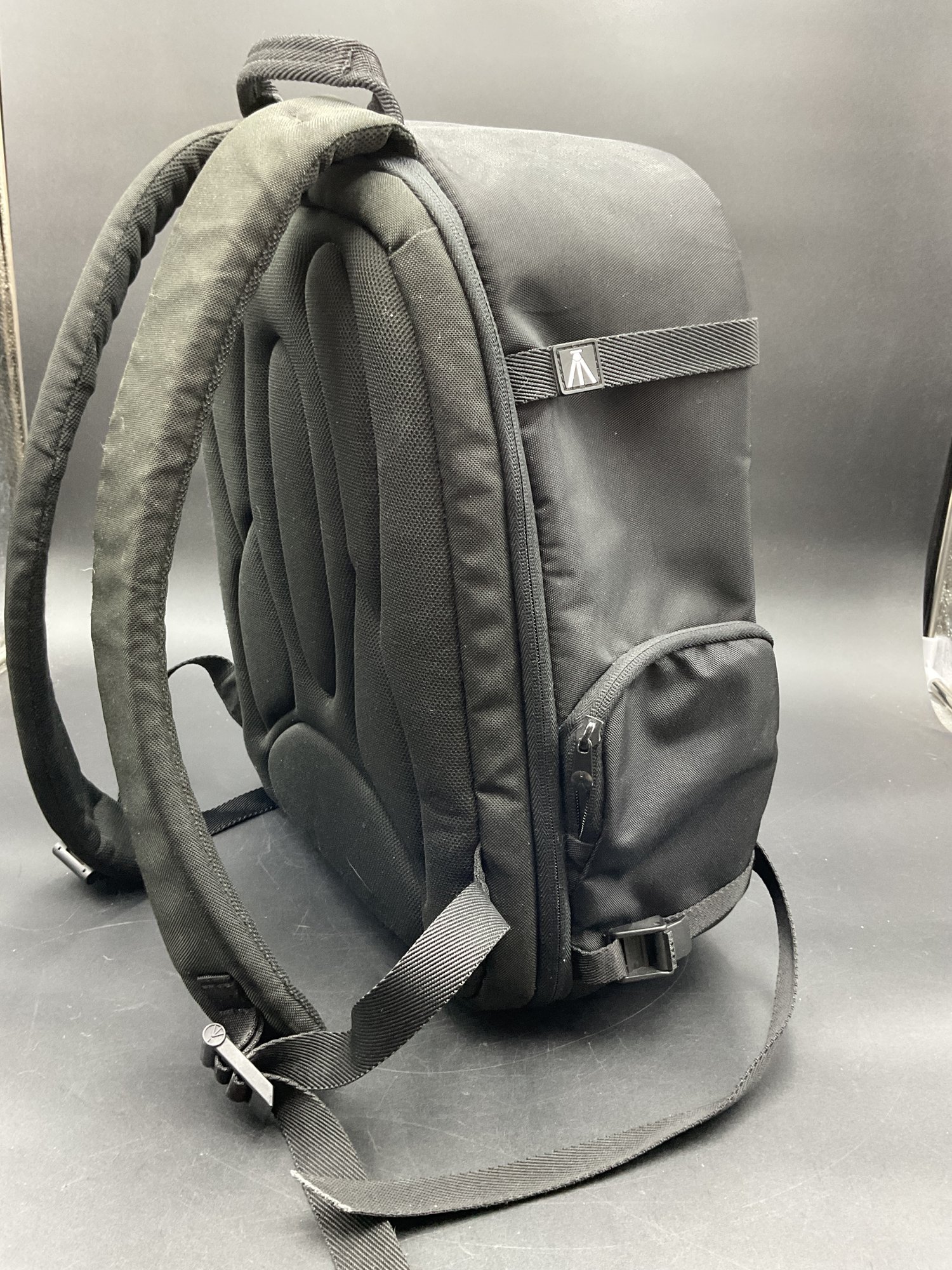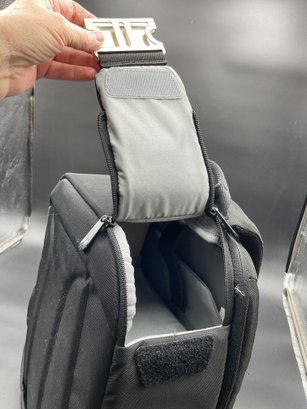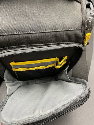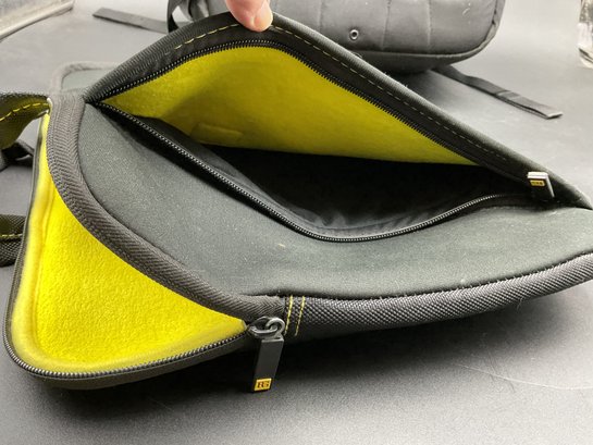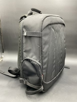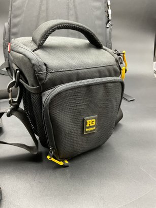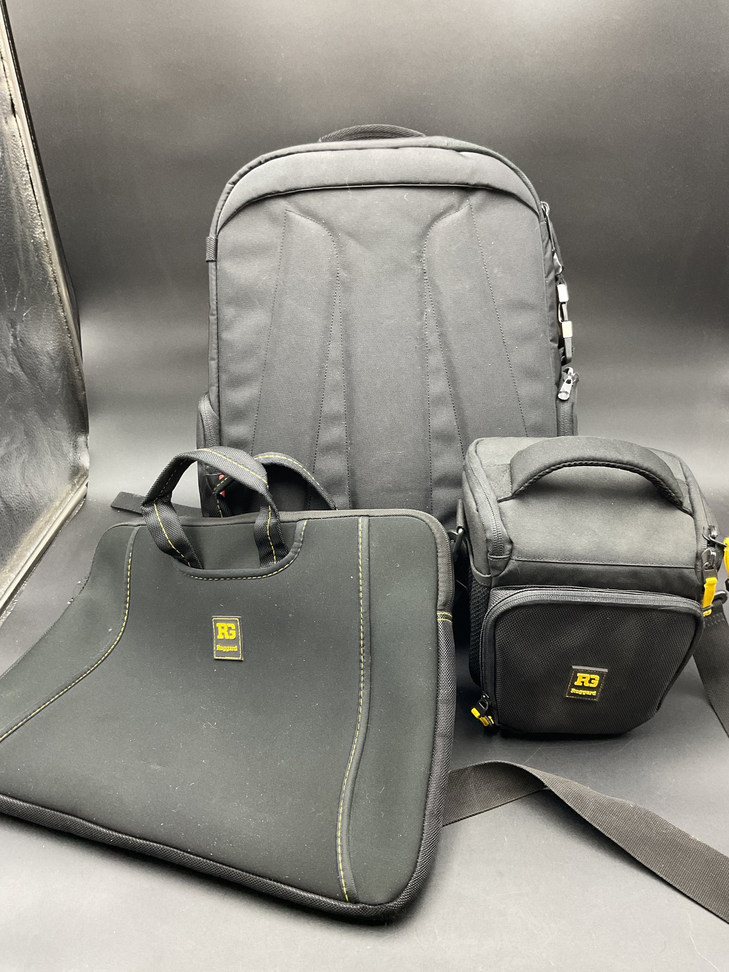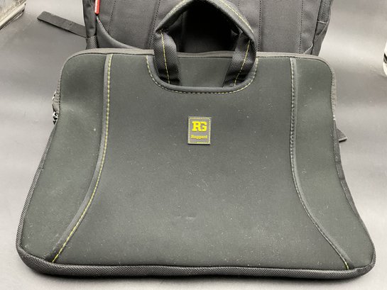 Two equipment bags and one padded briefcase, all in excellent condition. Used by a film maker, these carried delicate equipment safely on location. Includes a Manfrotto backpack style with adjustable compartment dividers and multiple storage options, a Ruggard camera case with neck strap, and a Ruggard neoprene briefcase with multiple storage pockets.