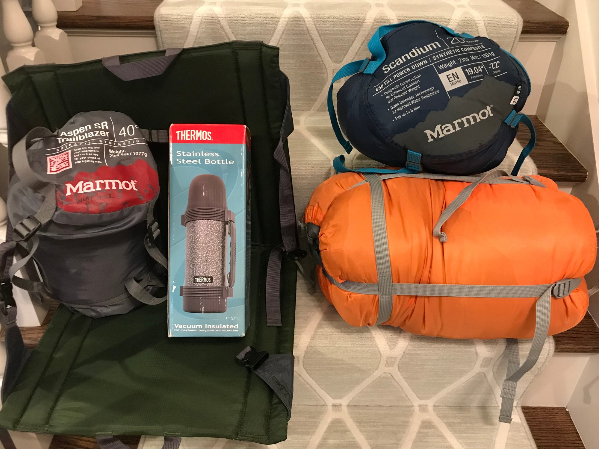 Includes 4 high quality sleeping bags, a thermos with box and a fold up seat pad.
