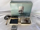 Early 2000s Canon digital camera in used but working condition with its original battery charger, extra storage card and box/manual.