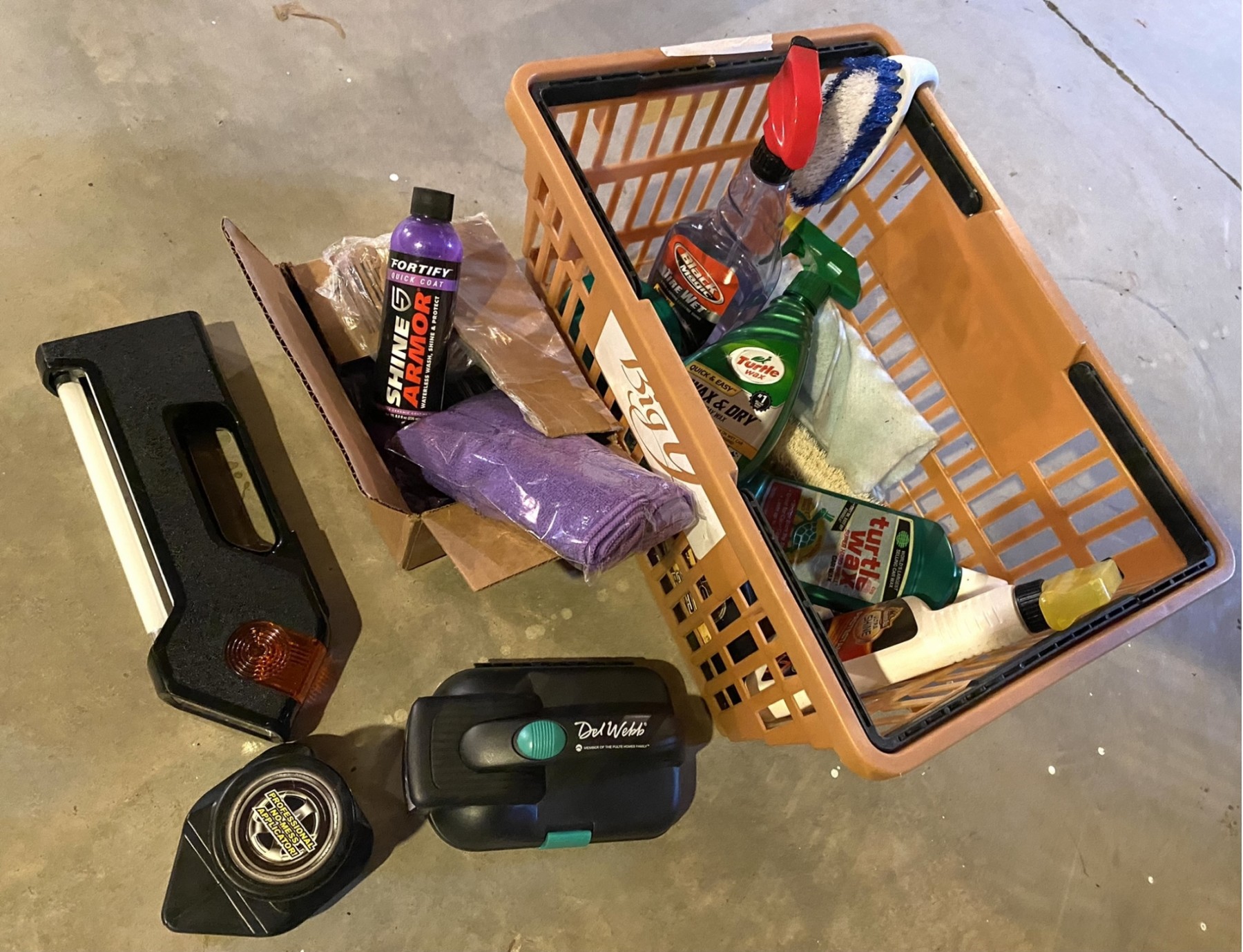 everready flashlight; del webb flashlight; tire cleaners, wax, and box of shine armor wateless wash, shine and protect