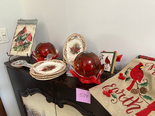 4 red bird plates; spoon rest; metal hanging, burlap hanging; wood wall hanging; 2 rose globes