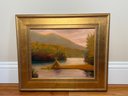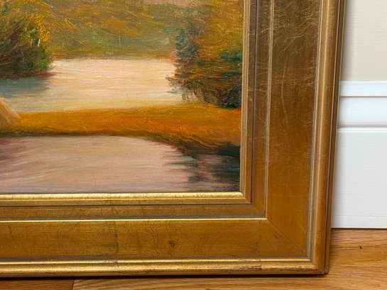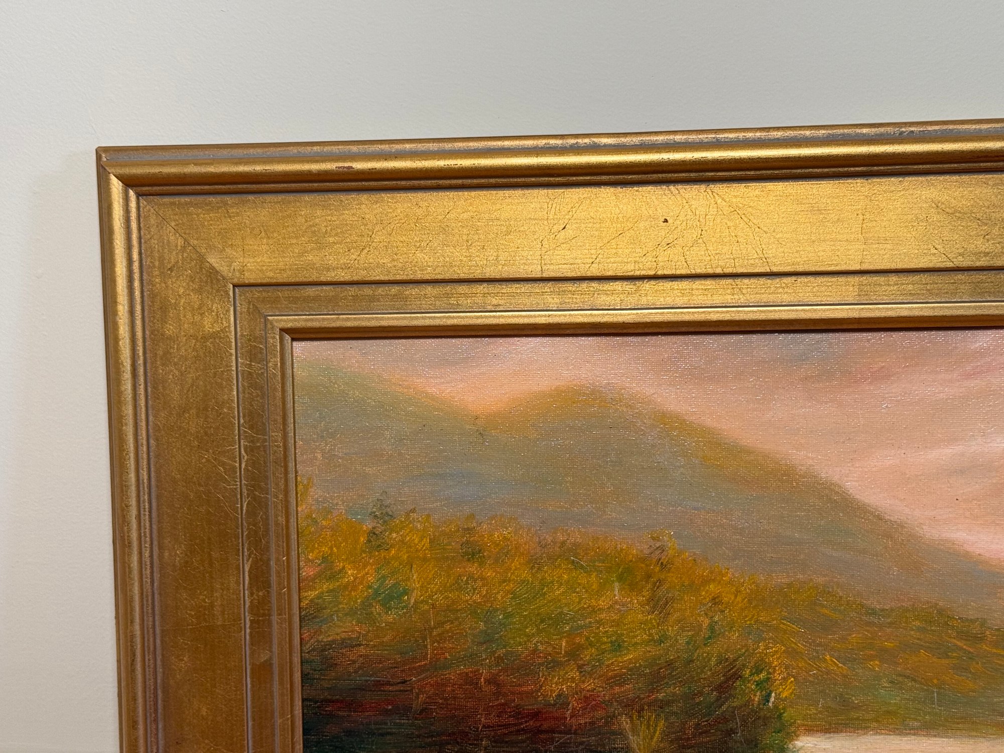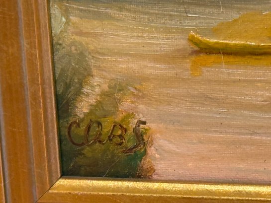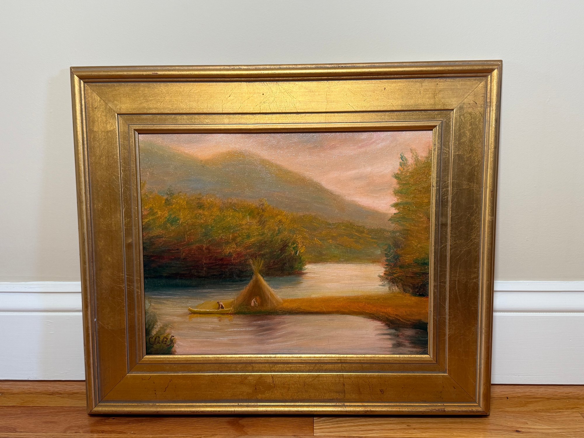 This beautiful painting by Carolyn Ann Bartolini Steward depicts a tent set up on the water on a gorgeous summer day. Signed lower left hand corner. Beautiful gold painted frame.
