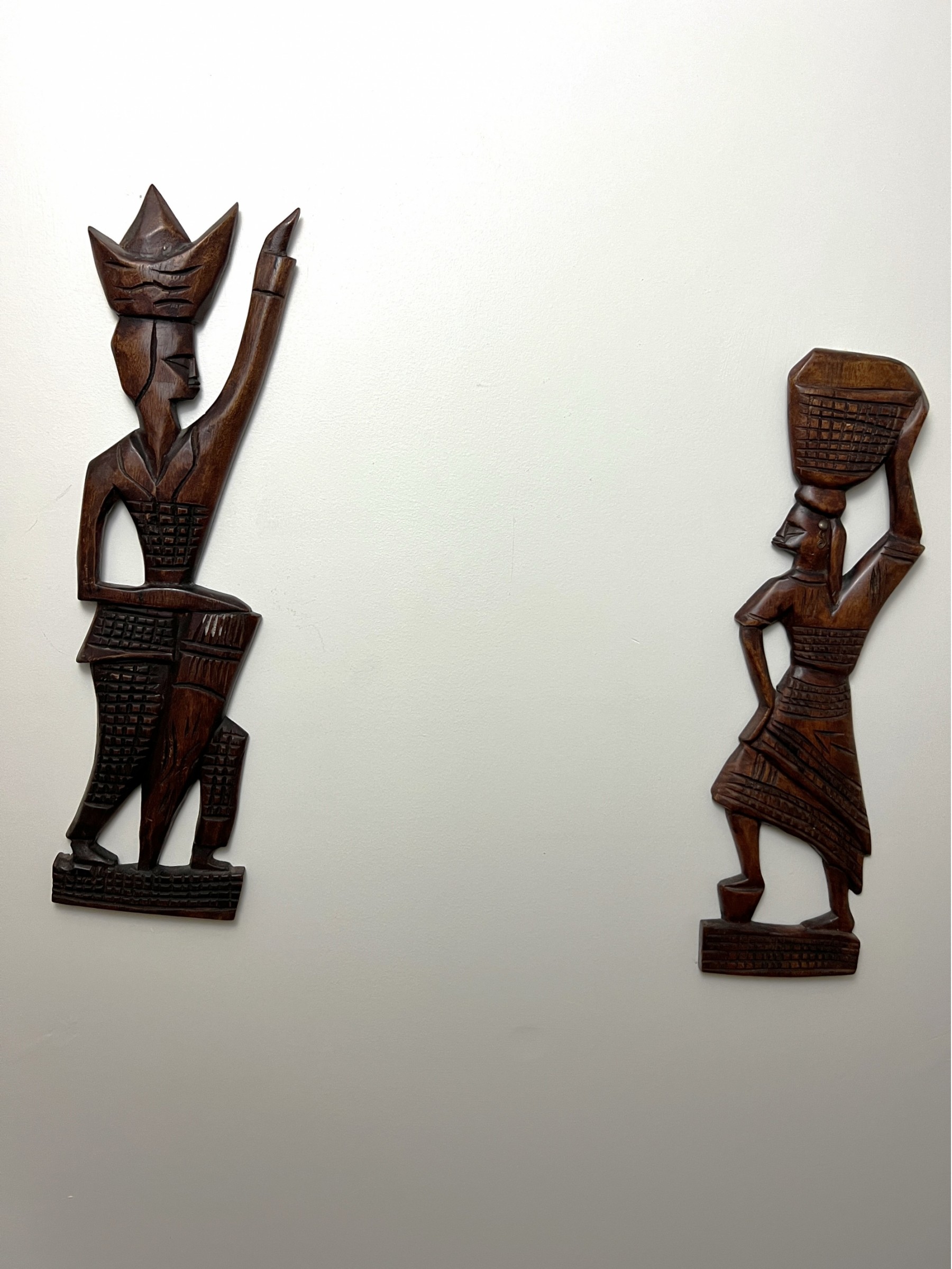 Pair of carved African style hardwood folk art wall figurines.