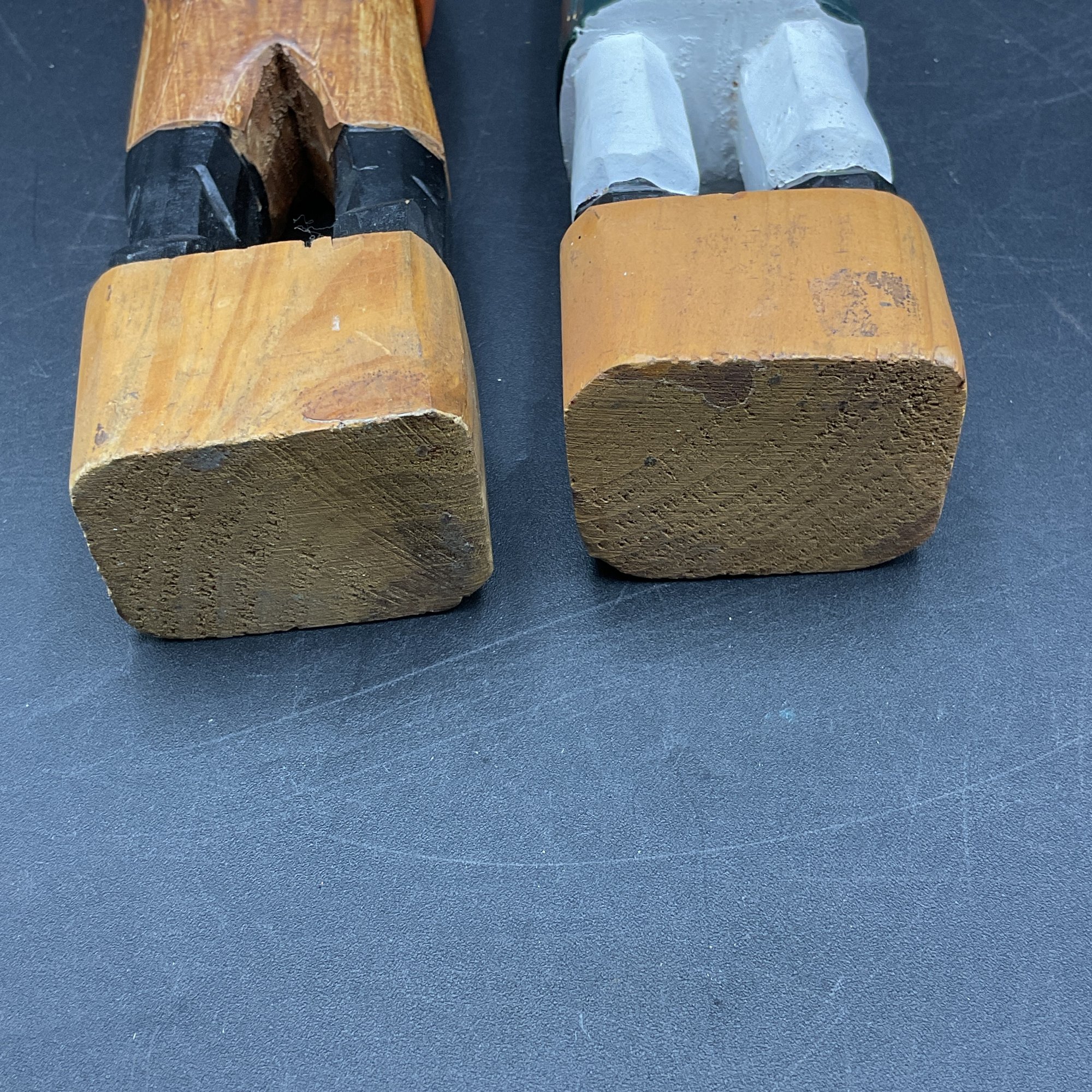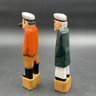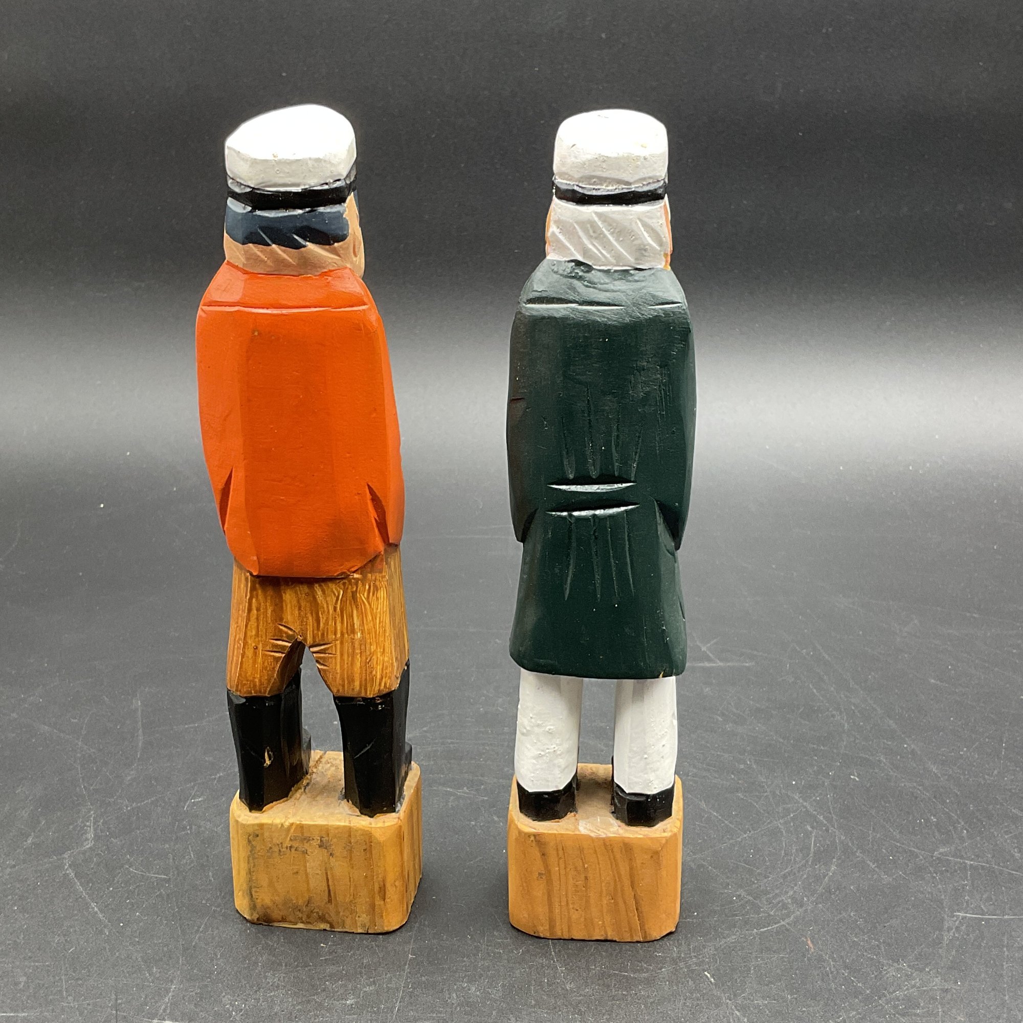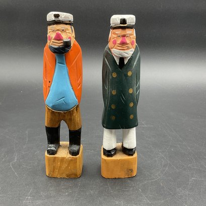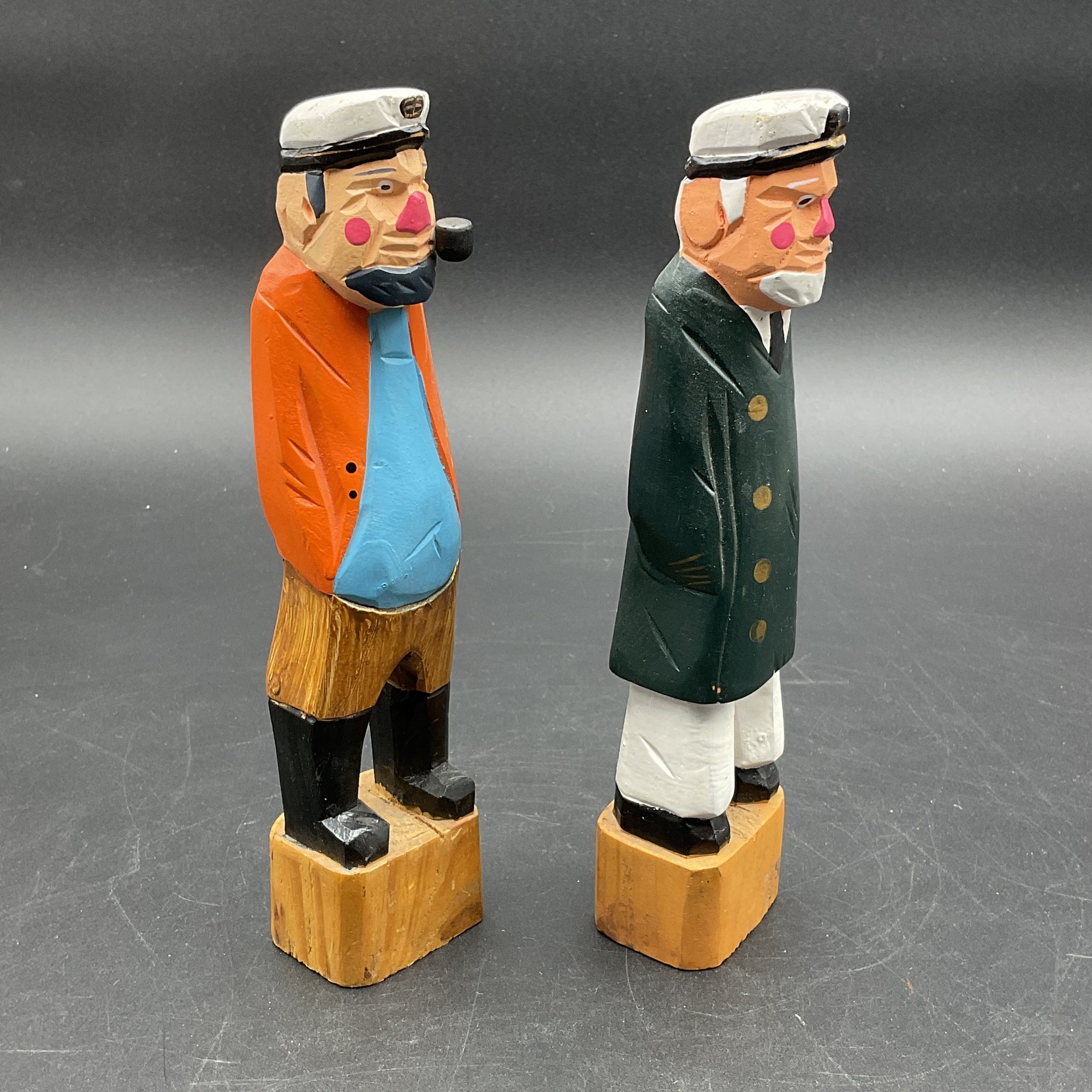 Pair of carved wooden fishermen in excellent condition. Captain in cap and buttoned coat, and seaman with pipe and orange coat. Hand carved and hand painted and full of personality!