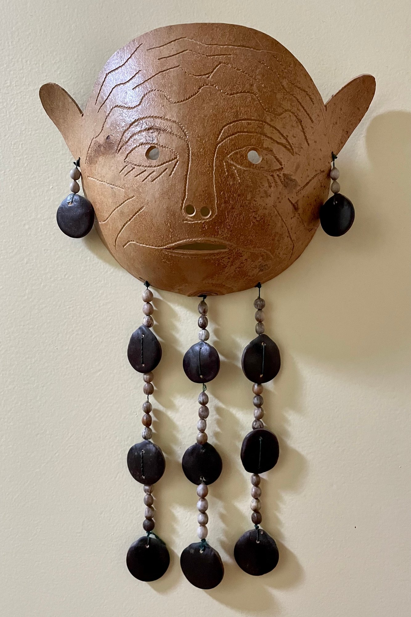 An exotic looking wall hanging in the form of a mask. It's made from a large gourd with an incised design on the face.