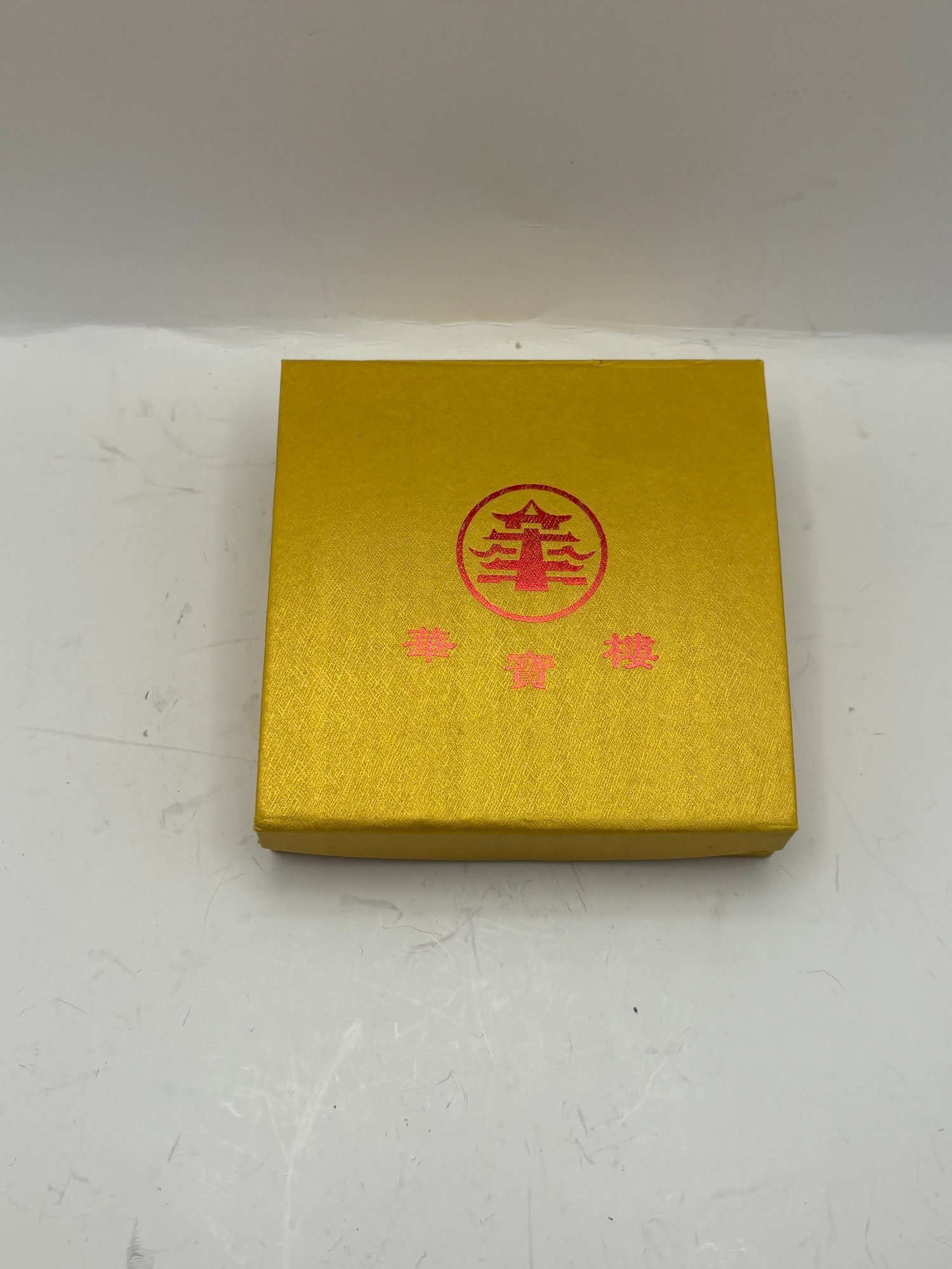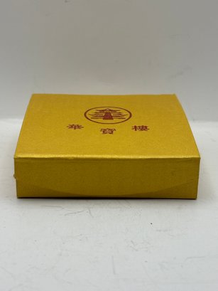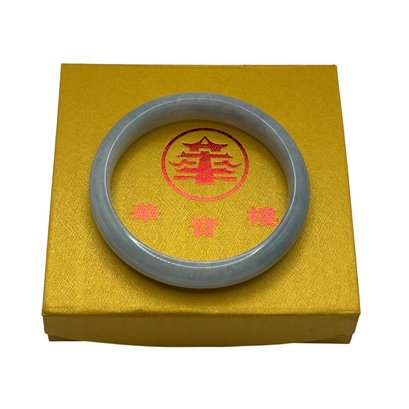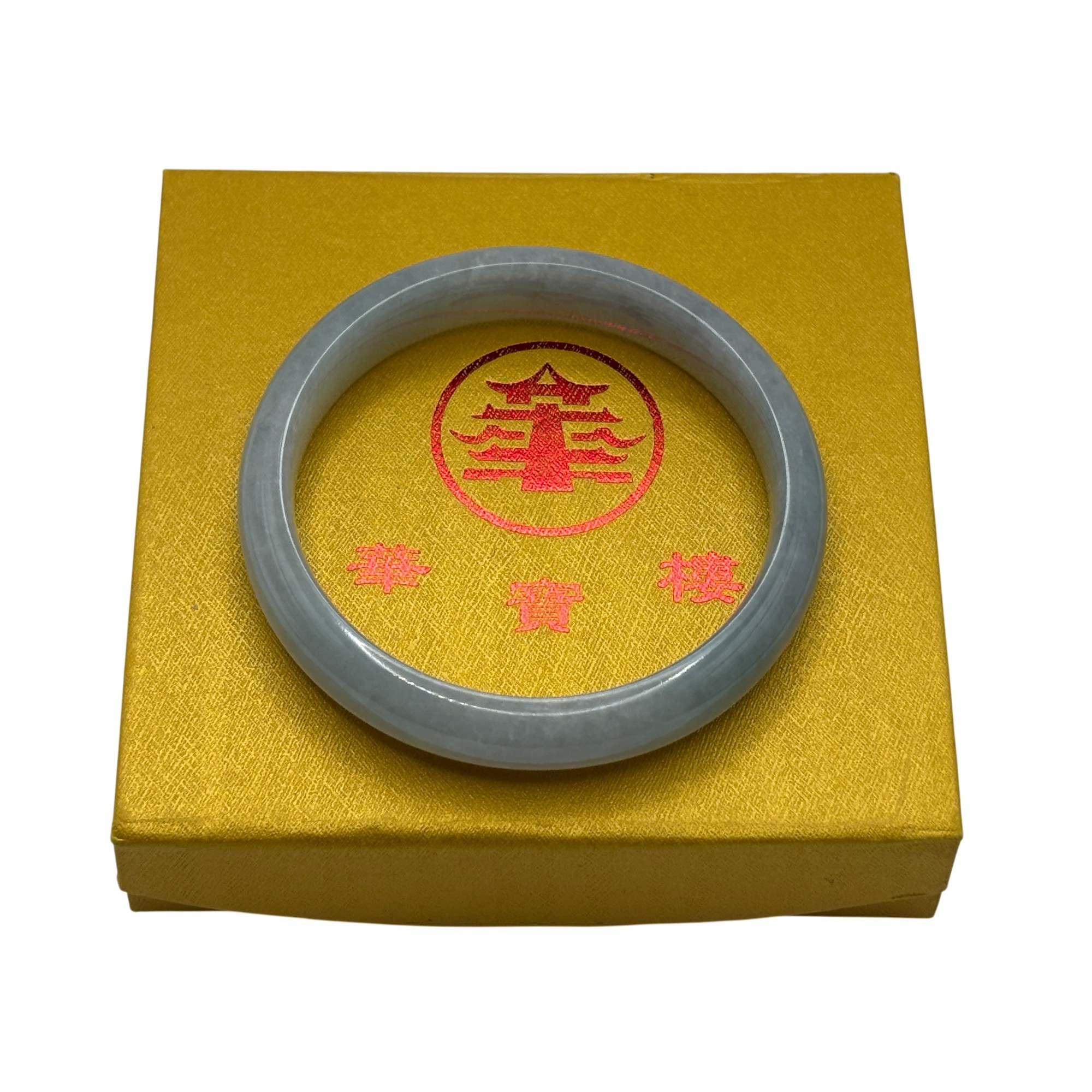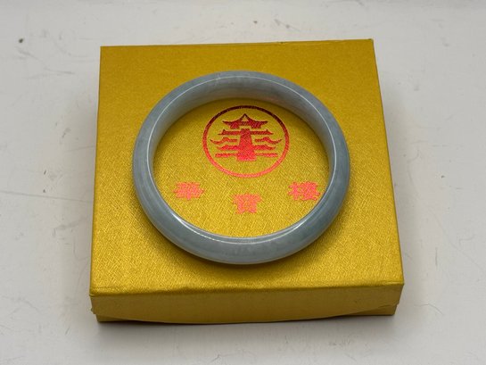 Presented in a decorative gold-tone box with red Asian-style characters and motif, making it ideal for display or gifting. The stone type has not been formally tested; it may be jade or a similar hardstone. Offered strictly as a decorative and wearable stone bangle with no guarantees as to specific material.