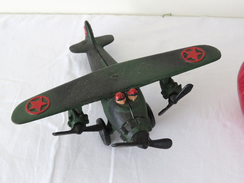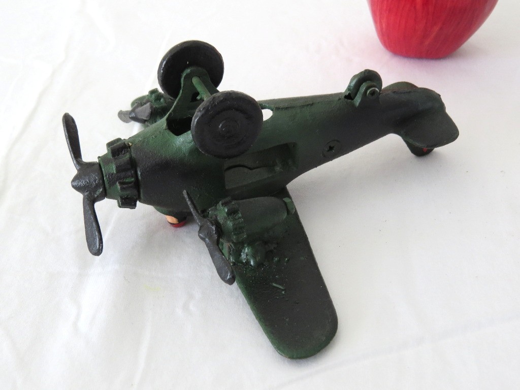 A cast iron toy fixed wing WWI style airplane toy, a reproduction of the early 20th C. originals.