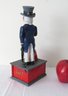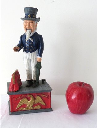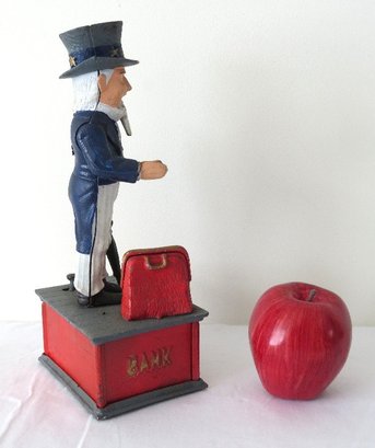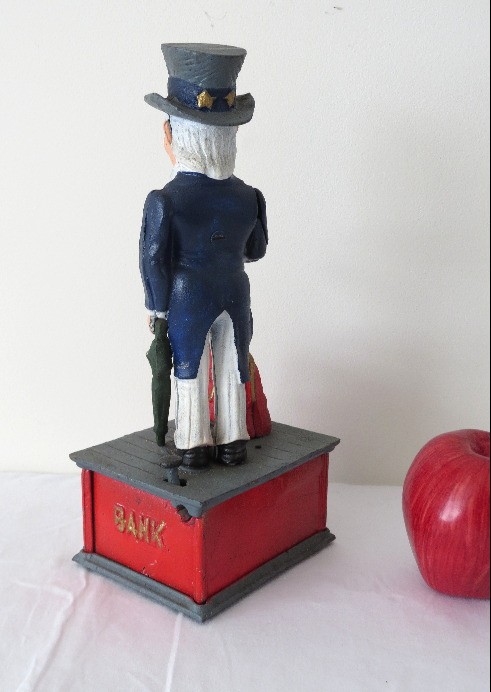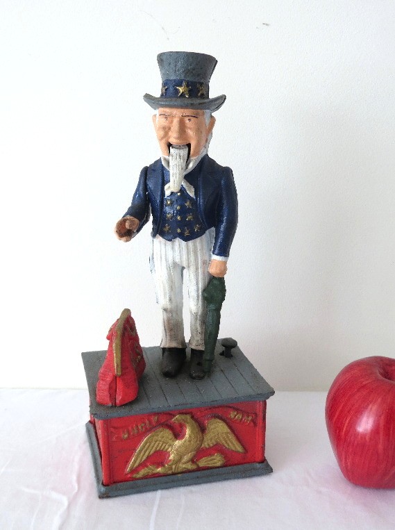 A cast iron mechanical bank in the form of good old Uncle Sam, a reproduction of the 19th C. originals. He drops his coin into the bag at his feet.