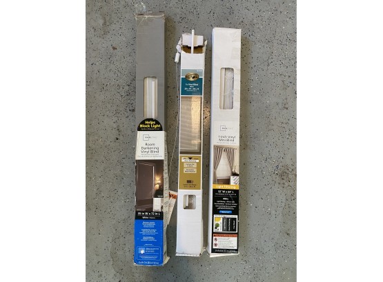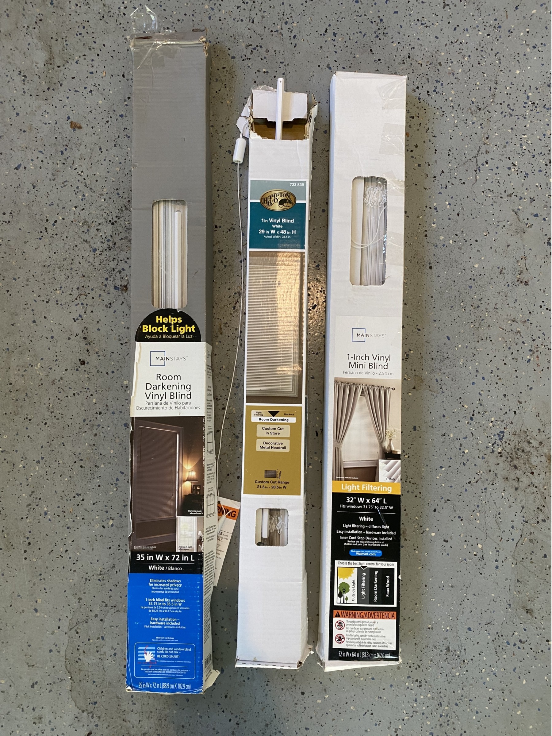 New in packaging, set of 3 vinyl 1" blinds. See all photos for details.