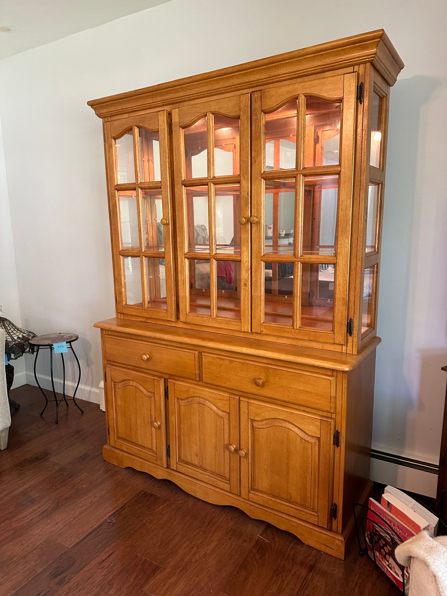3 glass doors on top with glass shelves and mirrored back, lighted. Bottom has 2 drawers and 3 door cabinet with interior shelves. Top measures 51 x 12 x 43; bottom 53 x 18 x 31. This piece would be great to attach top to wall and make storage cabinet with coffee bar on bottom.
