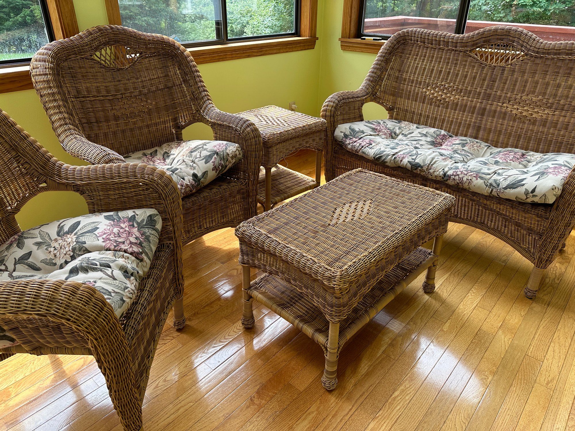 These are in perfect condition as far as I could see. The love seat measures 54 x 17 x 39 1/2; coffee table 30 x 18 x 18; side table 17 x 17 x23 - two chairs arm to arm 28 x 27 x 40. Includes cushions.