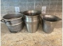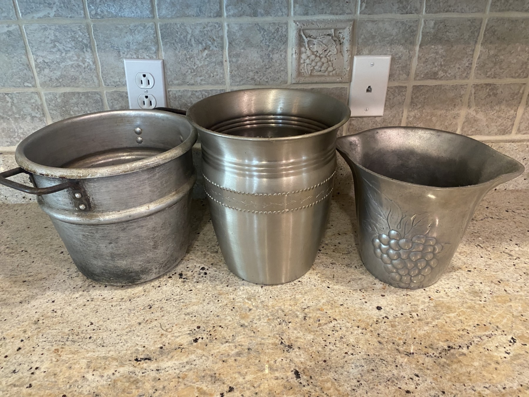 Centrumetal is a combination of metals and is forever shiny and bright. also includes tall metal planter and vintage 2 handled pot